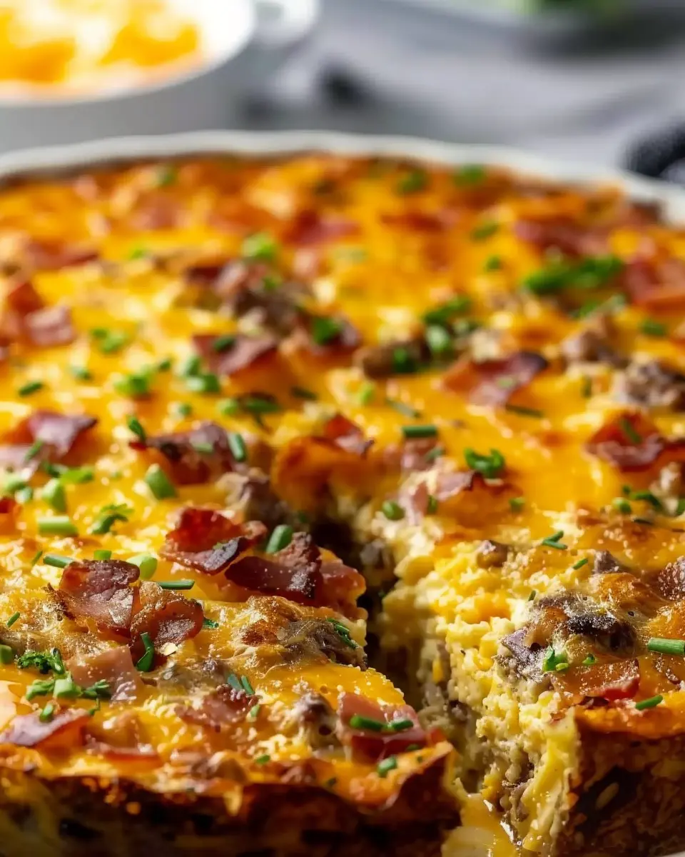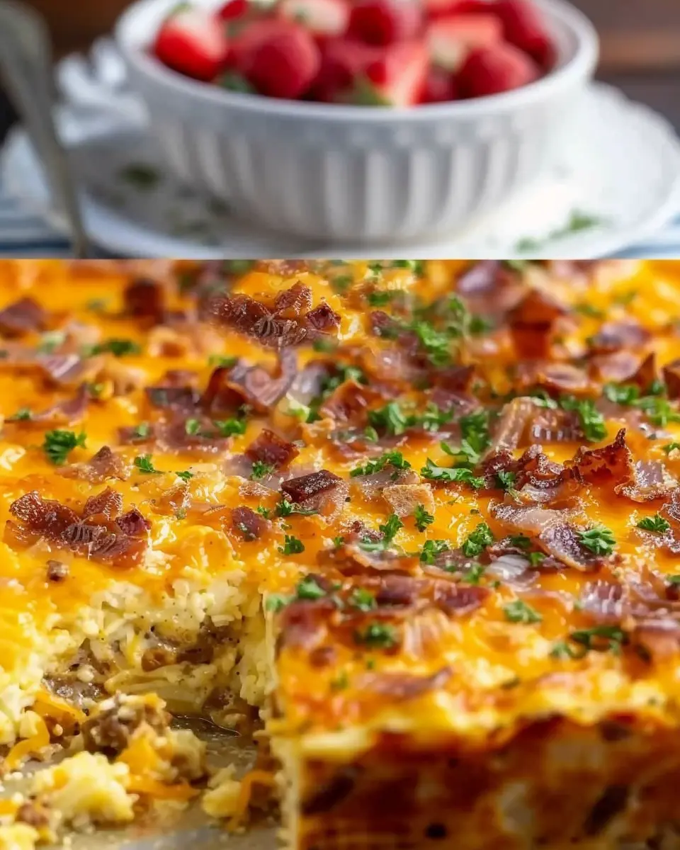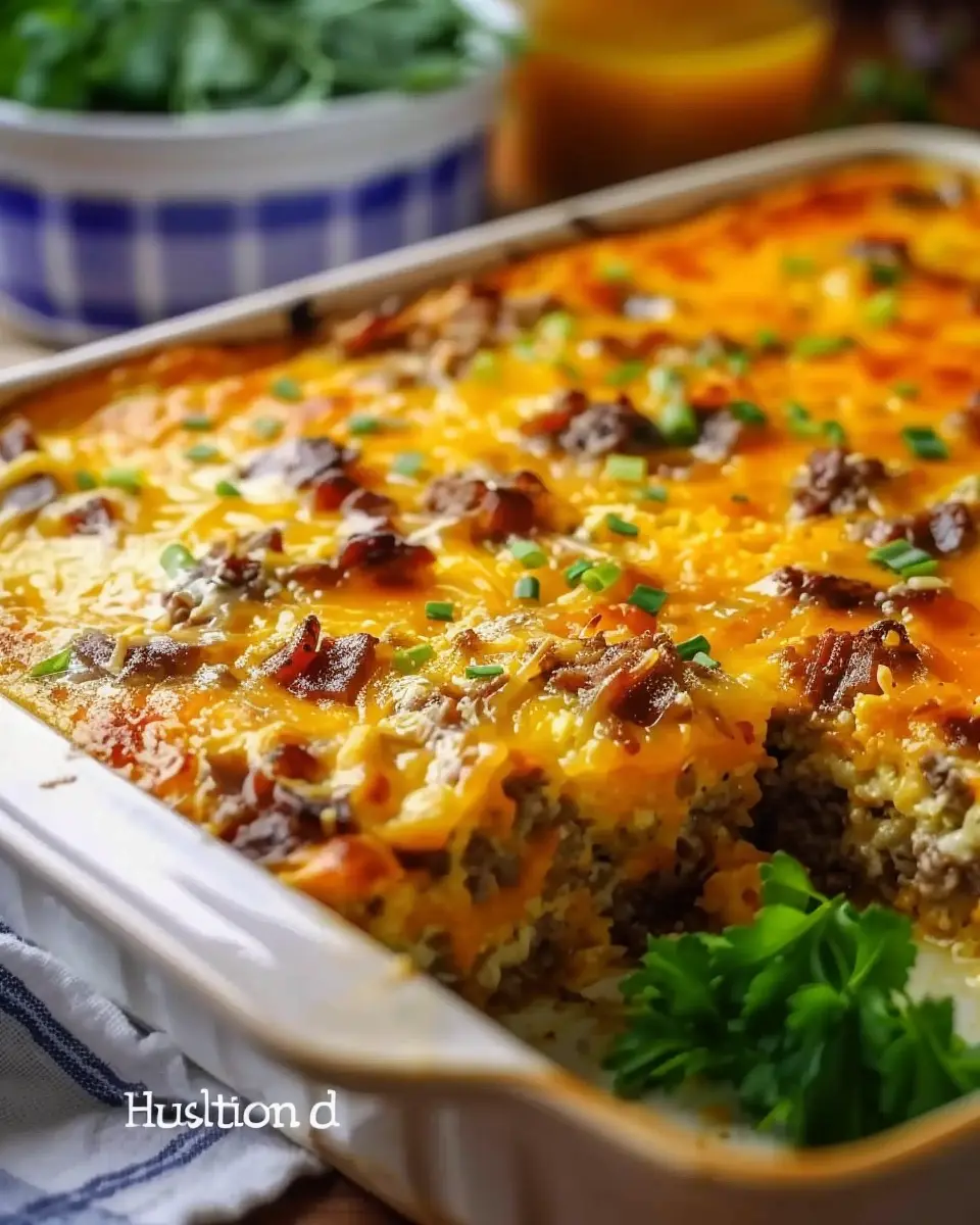 Preheat your oven to 350°F (175°C) and pop the casserole in for about 45 minutes, or until it’s beautifully golden brown and set in the center. You can test if it’s done by inserting a knife—if it comes out clean, you’re ready to feast! Once it’s out of the oven, let it cool for a few minutes, then garnish with fresh herbs if desired. Enjoy this delicious, wholesome breakfast with your loved ones, and watch how it brings everyone together at the table.