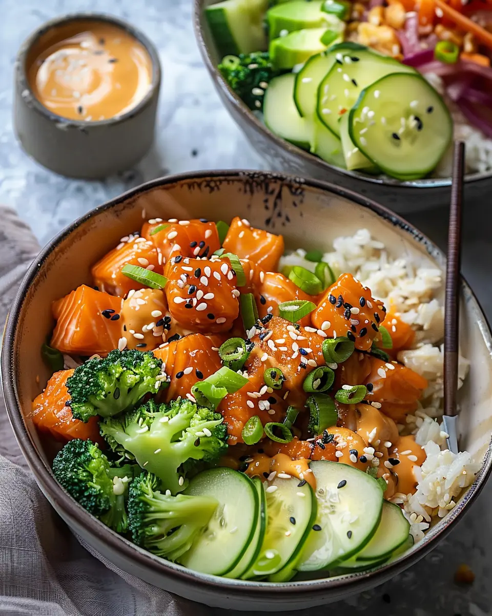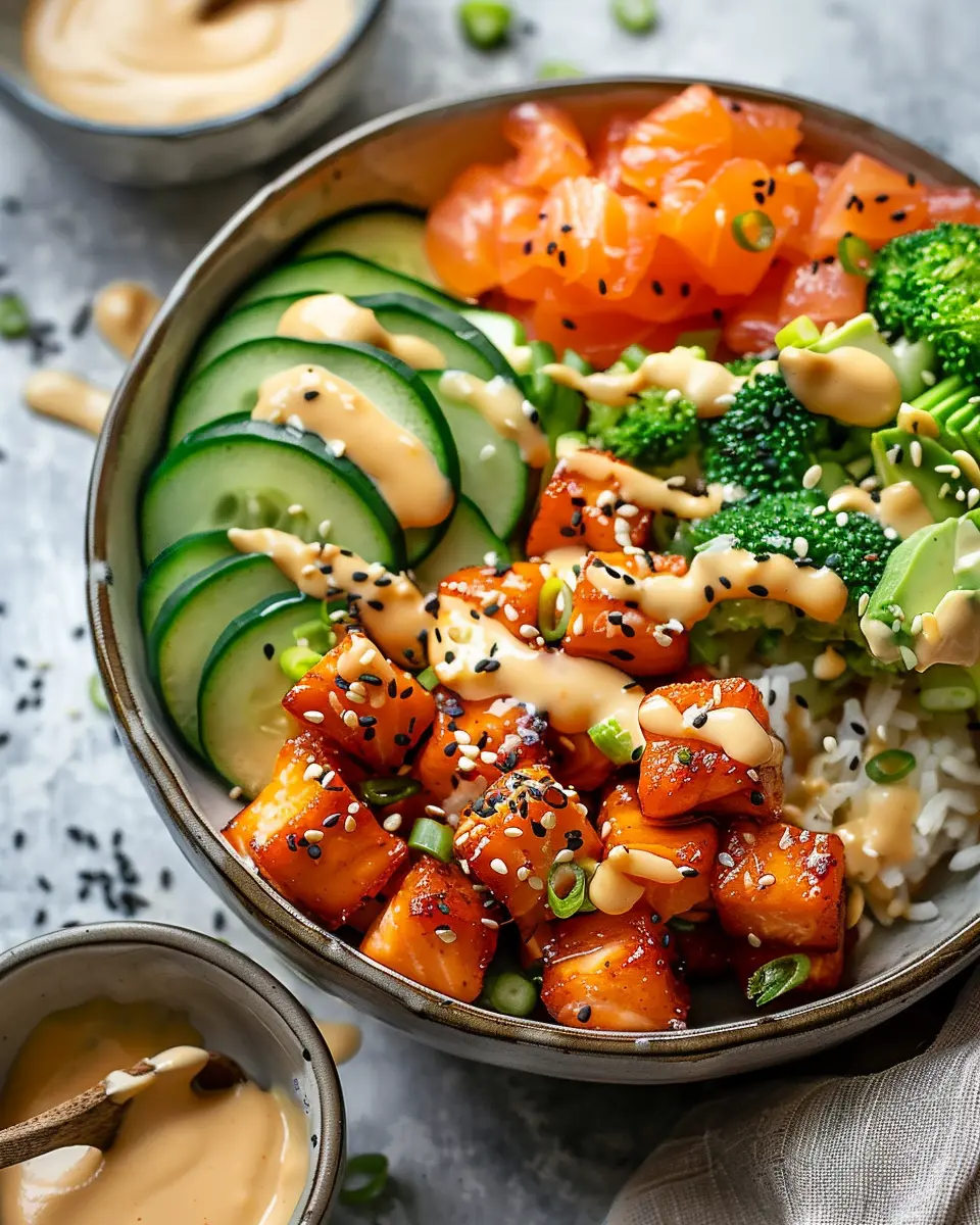• Layered Presentation: Think of using mason jars or clear bowls to showcase each layer—rice, salmon, veggies, and a drizzle of sauce.