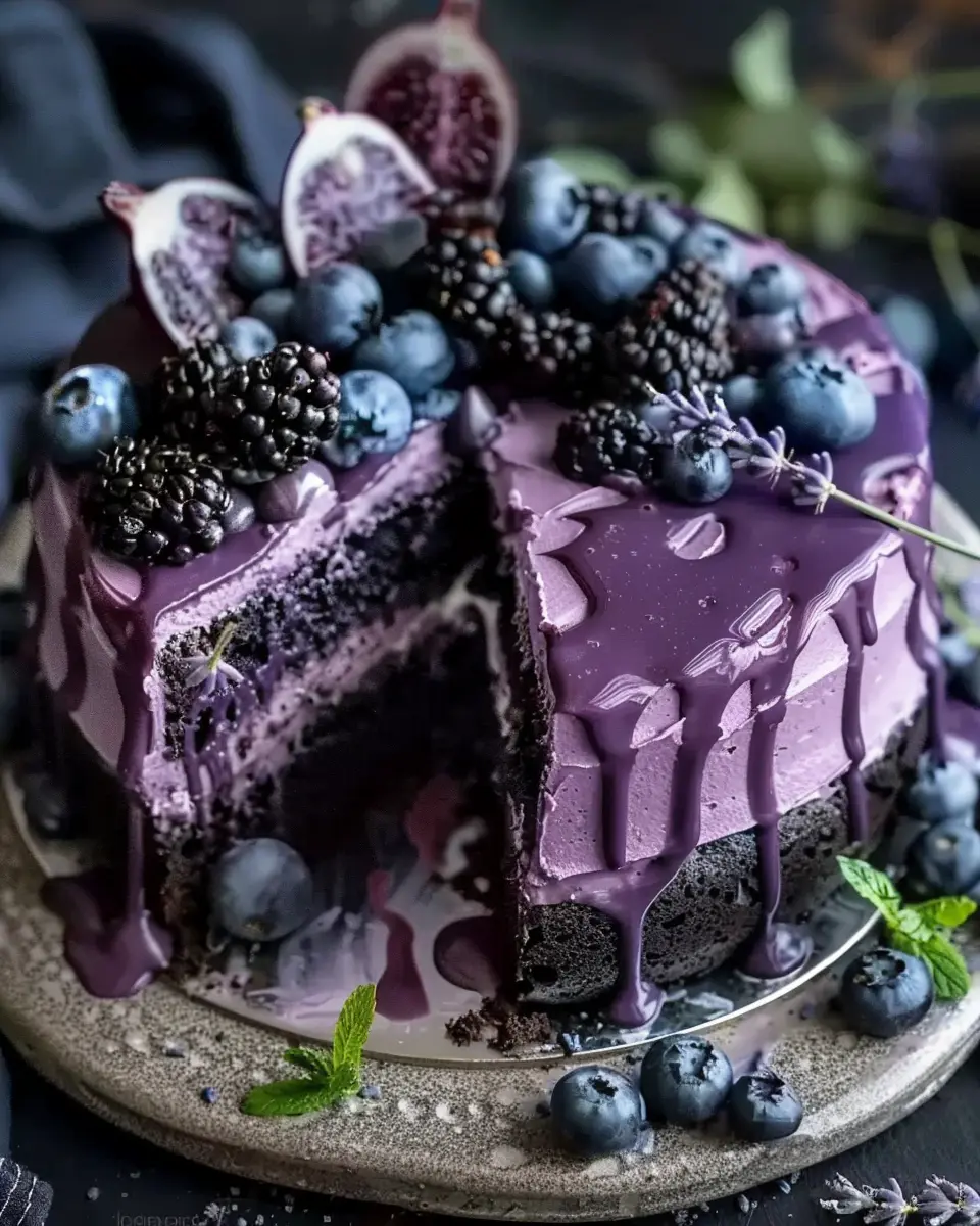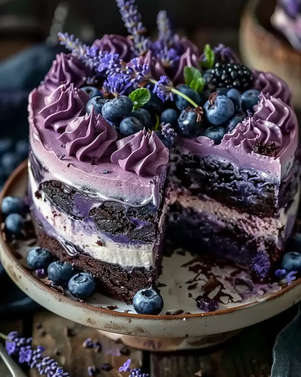 This Blueberry Chocolate Lavender Dream Cake blends rich chocolate, fresh blueberries, and a hint of lavender for a truly decadent experience.