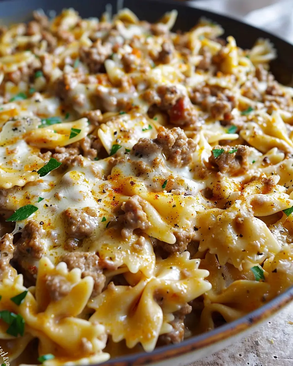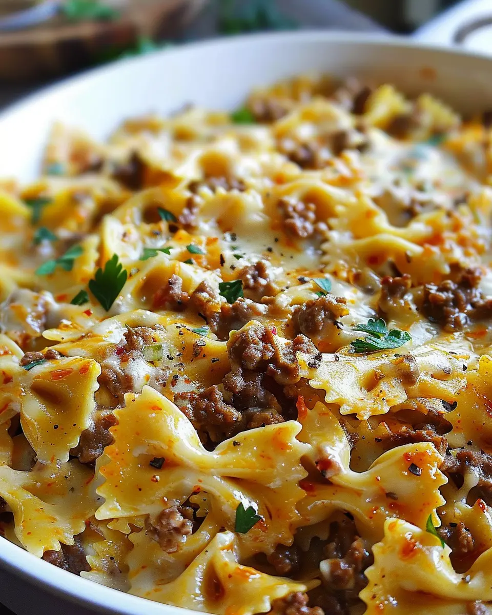 Cajun Cream Cheese Alfredo Bowties is a delicious, comforting pasta dish that marries the creaminess of Alfredo sauce with the bold, zesty flavors of Cajun spices. The star of this dish is undoubtedly the bowtie pasta, which captures the rich sauce beautifully. Picture creamy, smooth Alfredo enveloping perfectly cooked pasta, complemented by the warmth of Cajun seasoning and the irresistible taste of spiced ground beef. If you’re yearning for a dish that excites your taste buds while also filling you up, this is it.