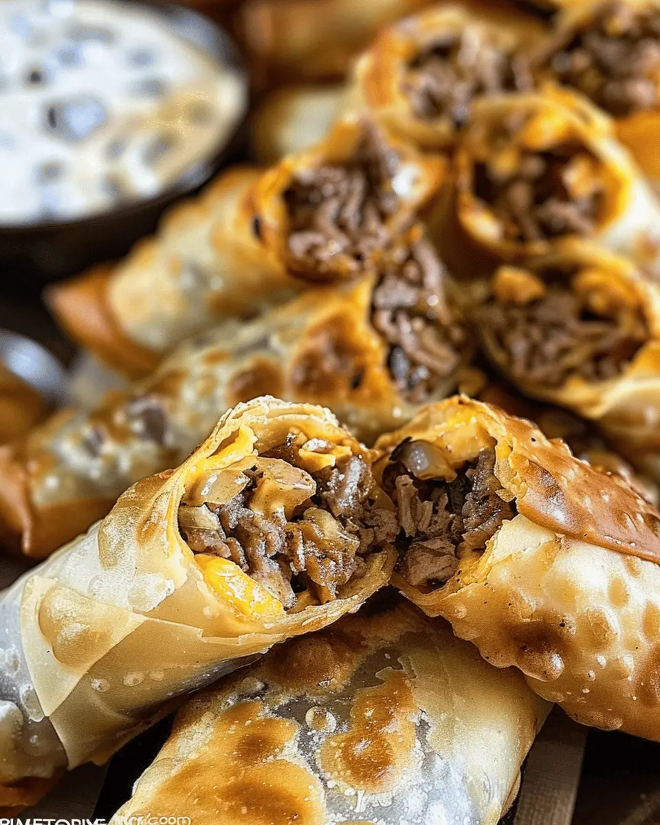 Enjoy delicious Cheesesteak Egg Rolls, a perfect homemade snack that combines juicy beef, melted cheese, and crispy wrappers.