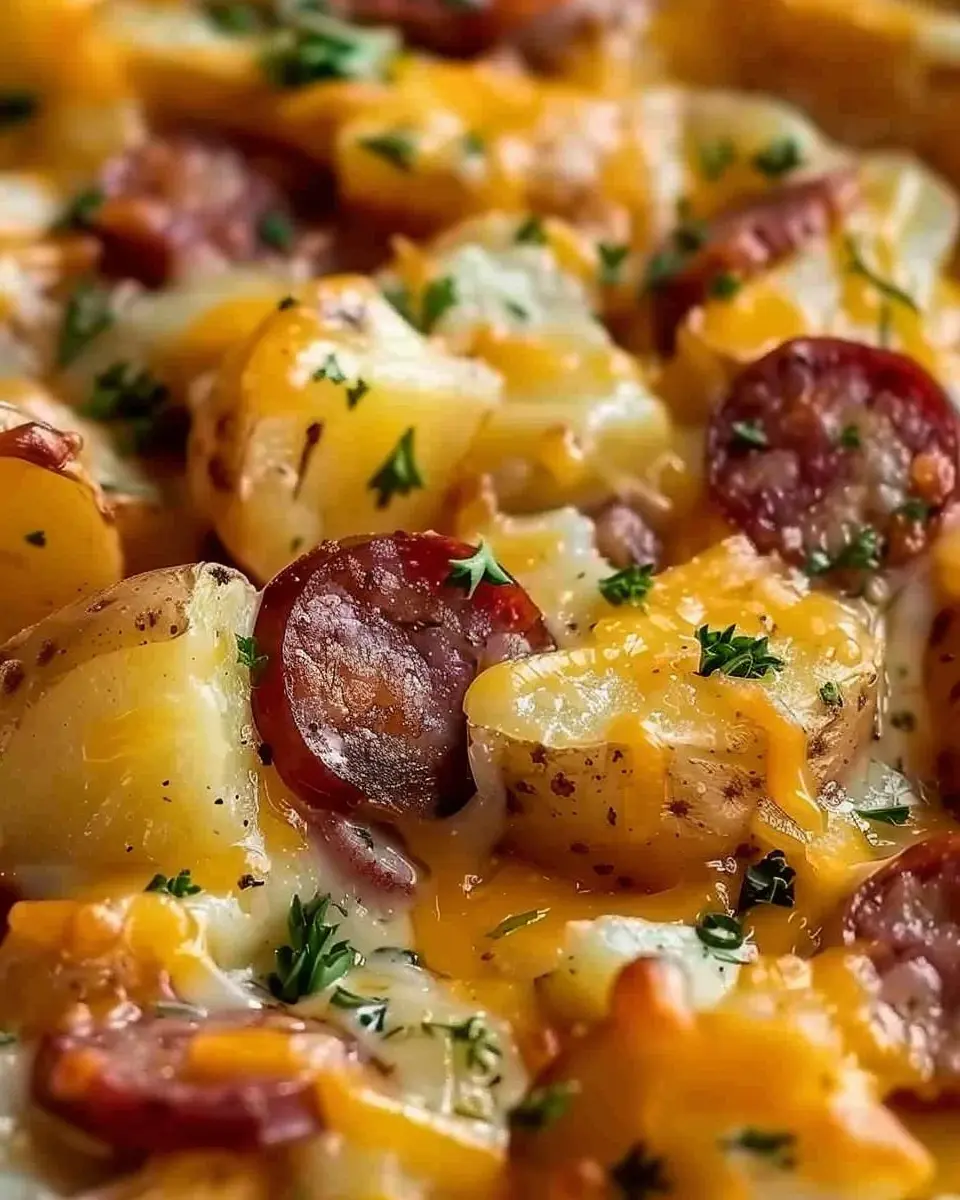 A delicious and comforting dish of cheesy ranch potatoes combined with smoked sausage, perfect for family dinners.