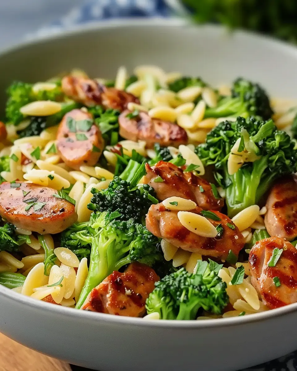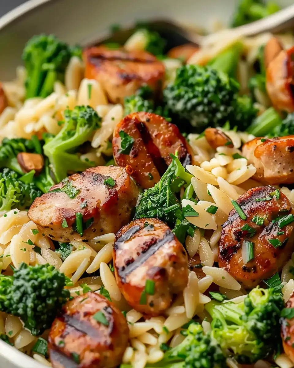 A quick and delicious one-pot meal featuring chicken sausage and fresh broccoli mixed with orzo pasta.