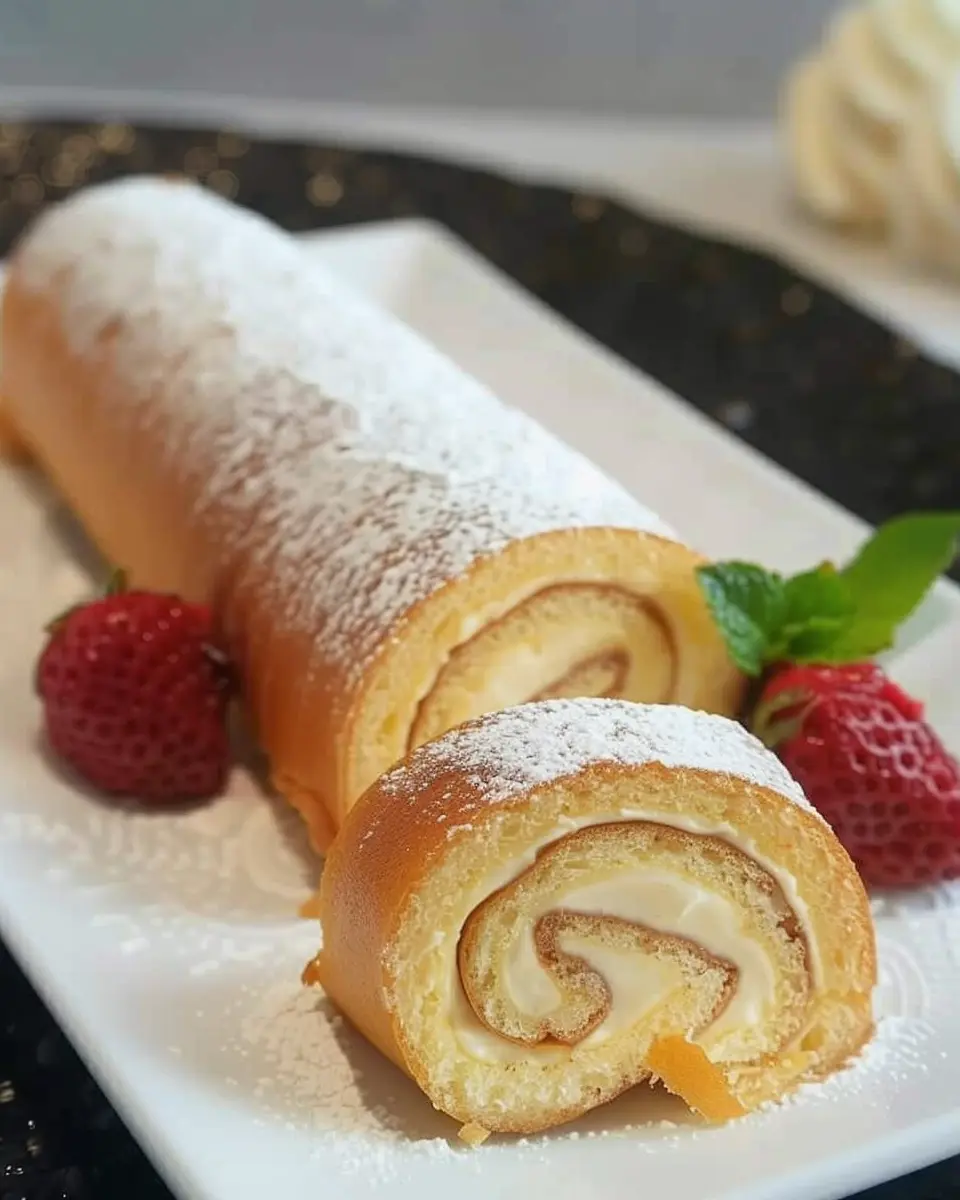 Once baked, remove the Swiss roll from the oven and let it cool slightly before inverting it onto a clean kitchen towel that has been dusted with powdered sugar. Peel off the parchment paper and, while it’s still warm, begin rolling it up with the towel itself. This process helps the cake retain its shape when filled and served.