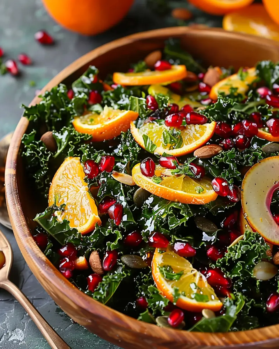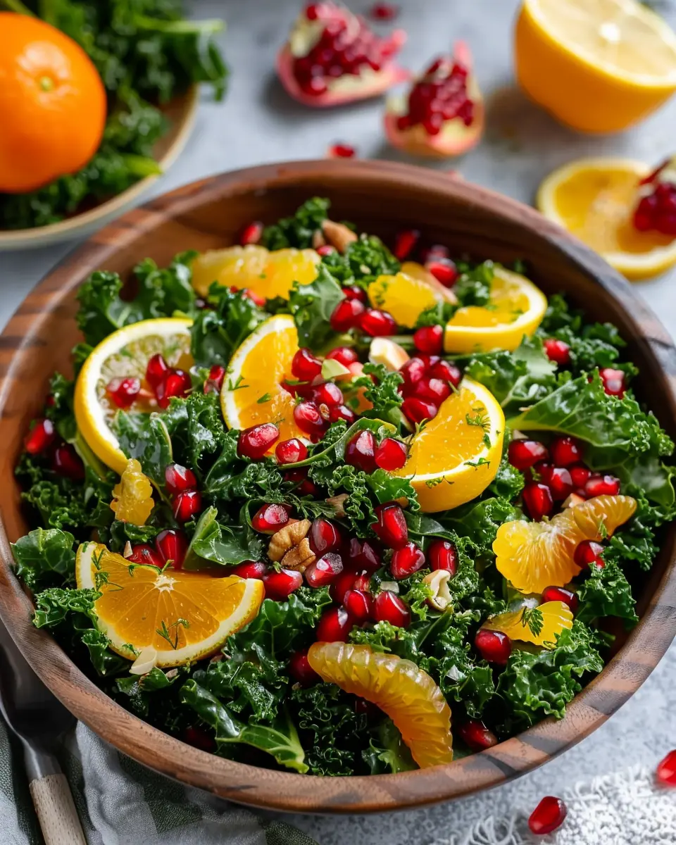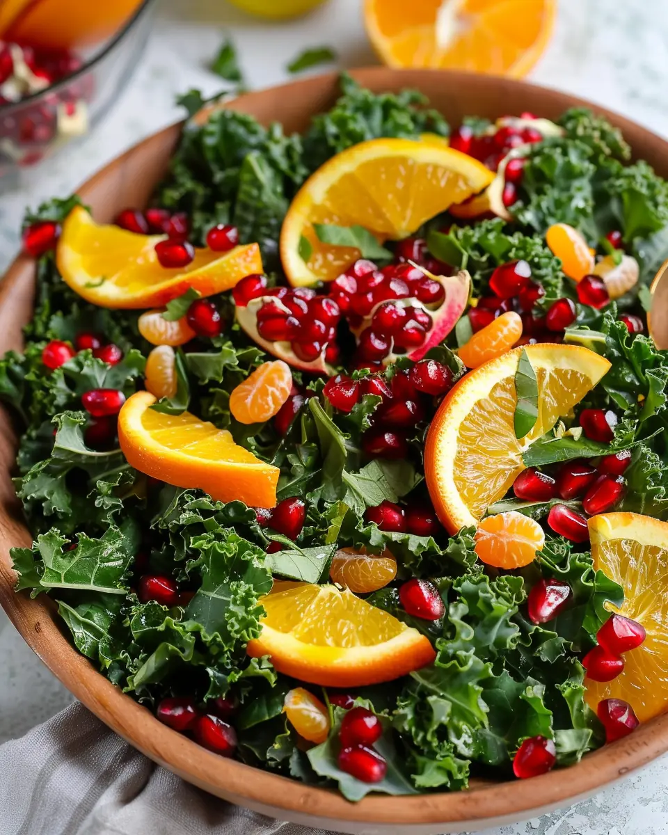 But it’s not just about health; it’s also about flavor and presentation. The vivid colors of the citrus and pomegranates against the deep green of kale are visually appealing, making it a perfect choice for gatherings or even just a weekday meal. Imagine serving this to friends at a dinner party or enjoying it on a quiet night in—it elevates simple moments!