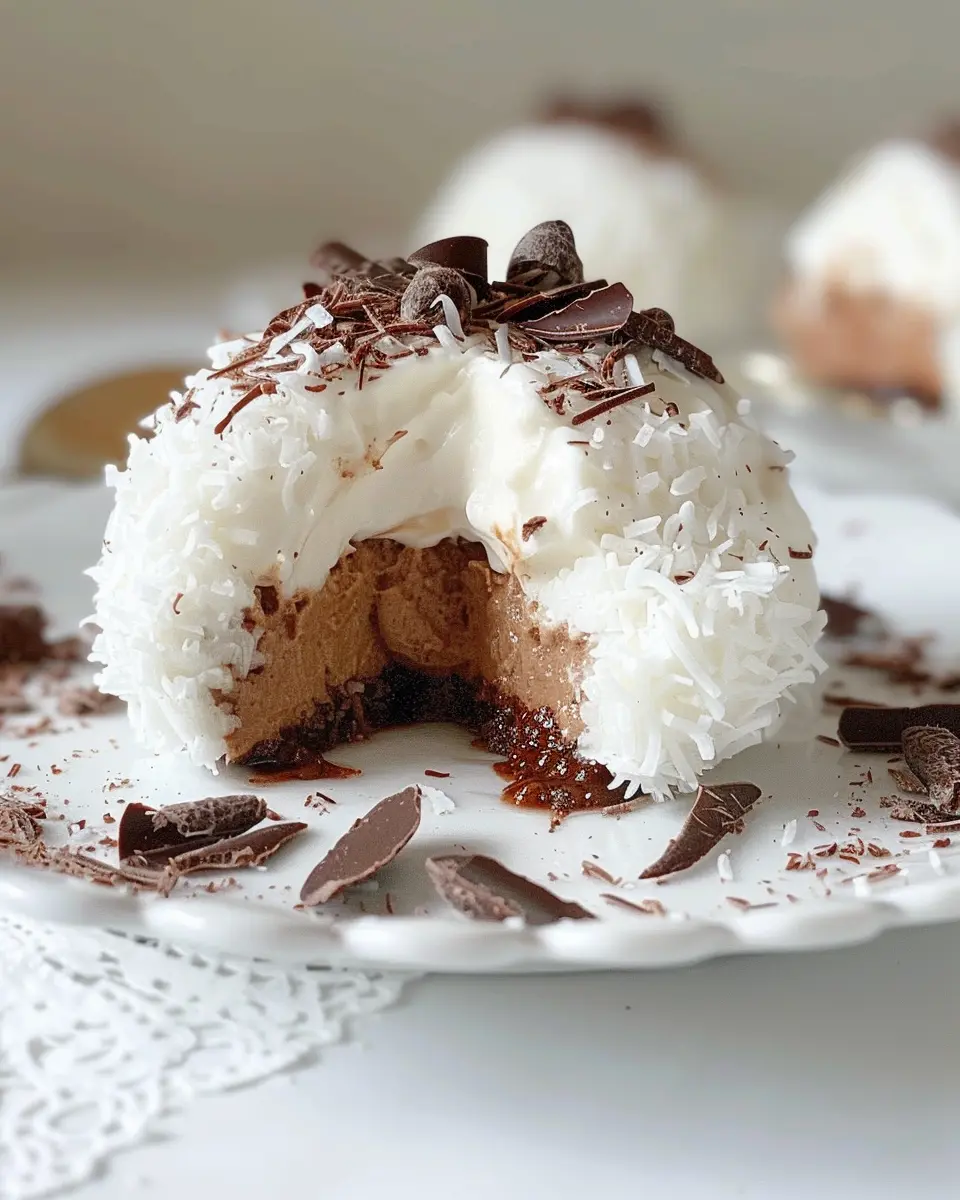 Indulge in the heavenly flavors of the Coconut Dome with Chocolate Spread, a dessert that combines the creamy texture of coconut with rich chocolate.