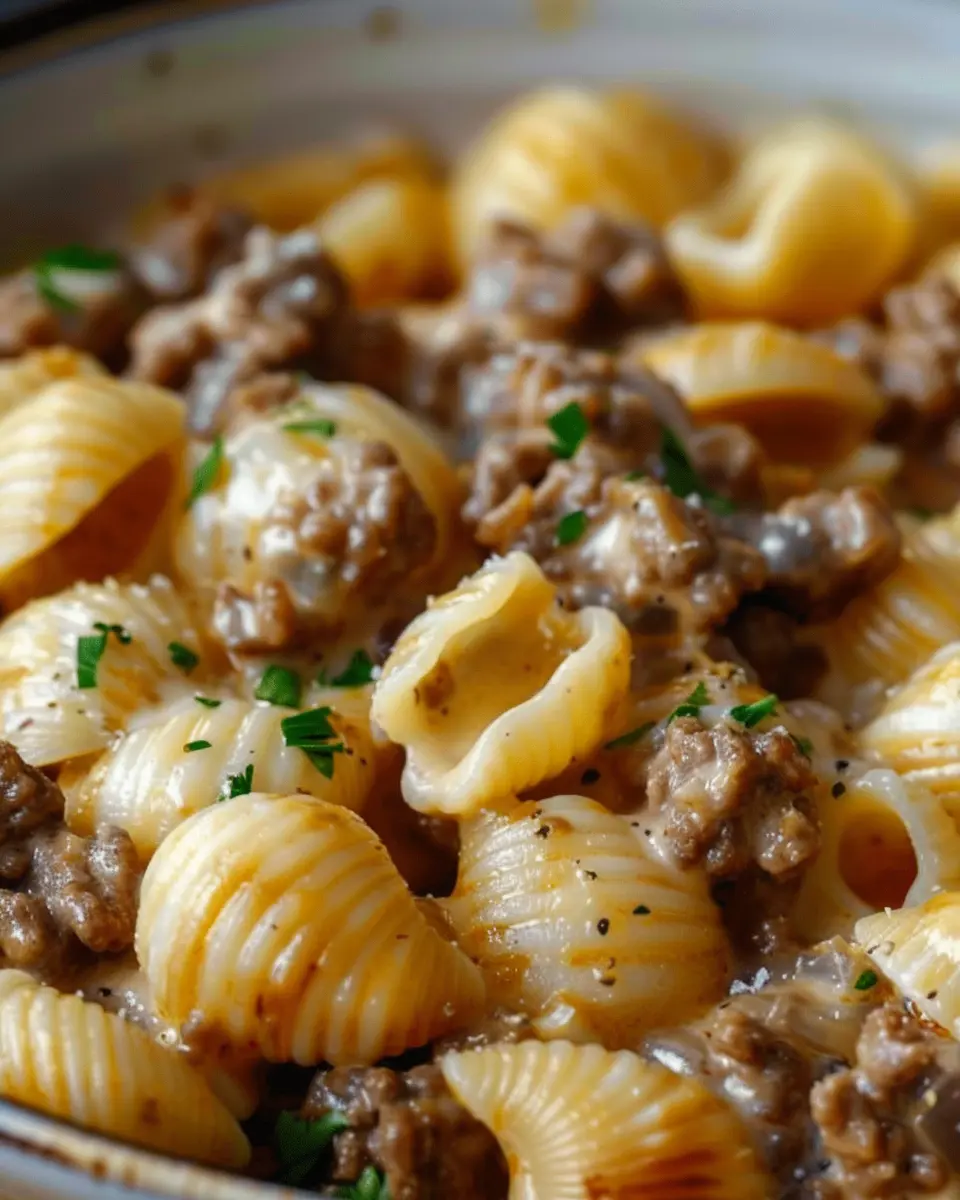 A comforting dish blending creamy sauce with beef and shells, perfect for any weeknight meal.