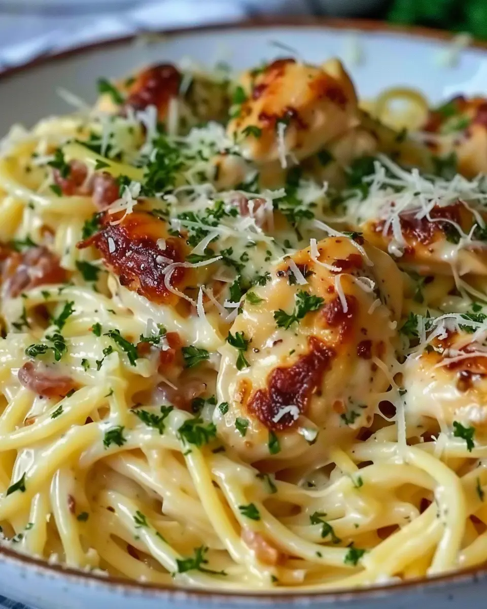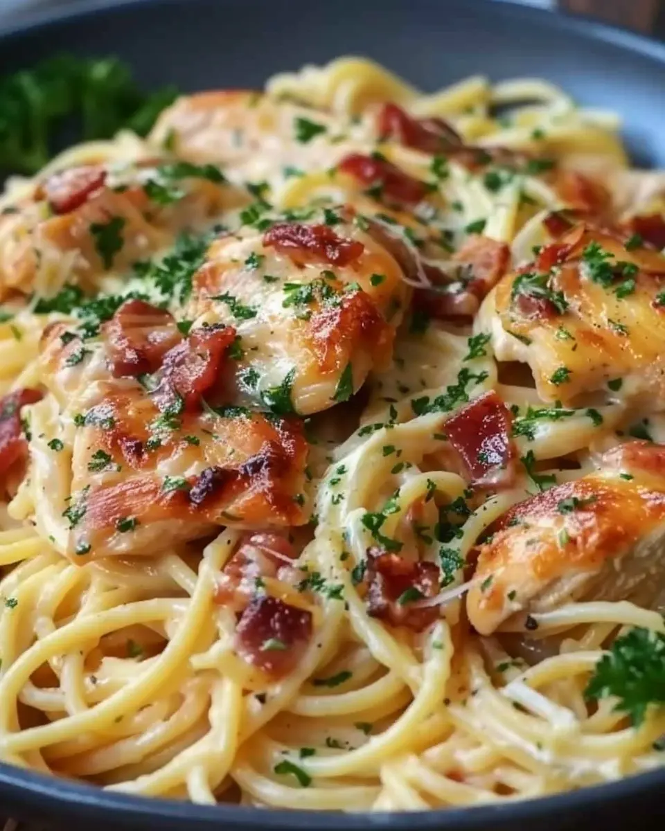 PrintCreamy Chicken Spaghetti: Easy Comfort Dinner with Turkey Bacon