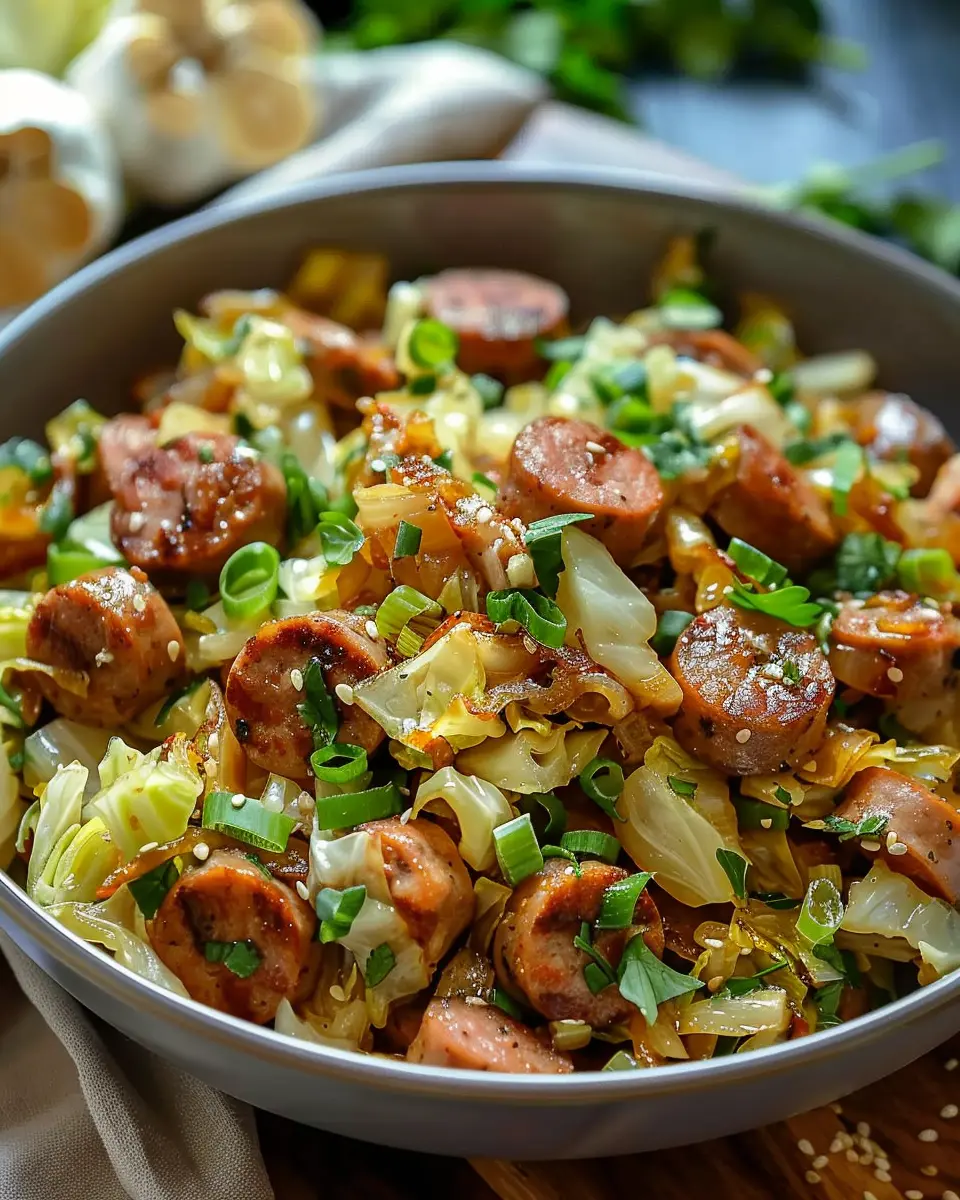 A quick and savory delight that combines sausage and cabbage in a delicious stir fry.