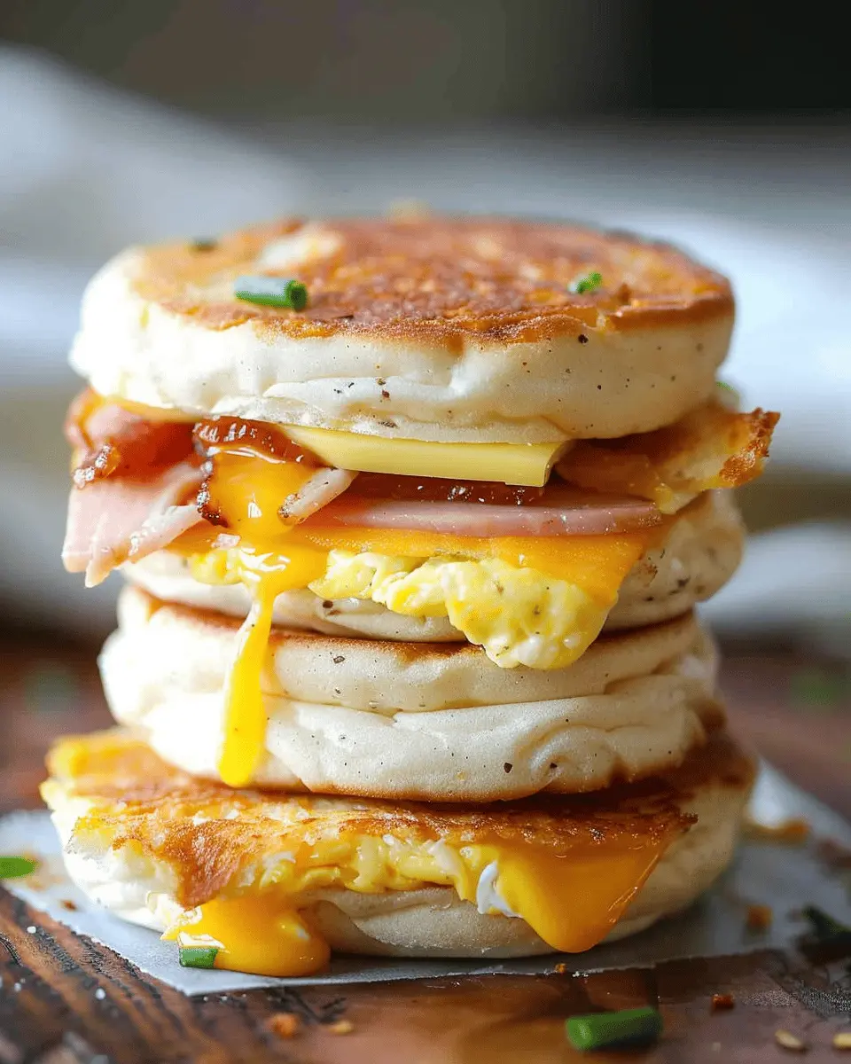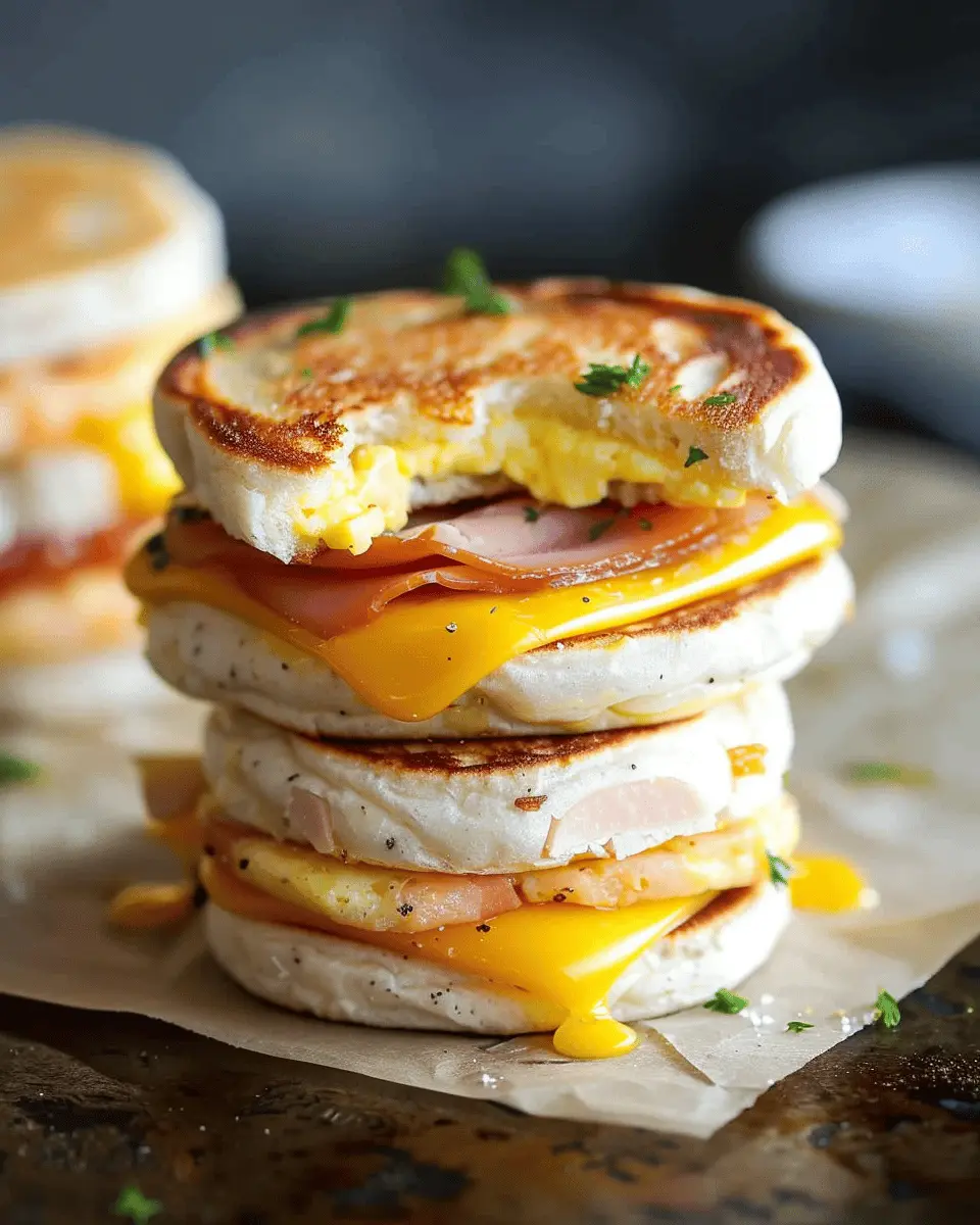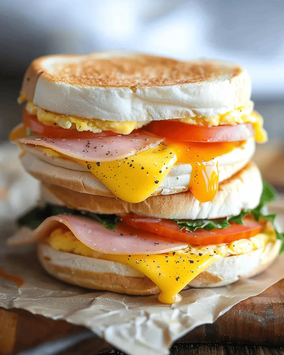 - Assemble the sandwiches with a slice of cheese, turkey bacon, chicken ham, and a cooked egg between each muffin.