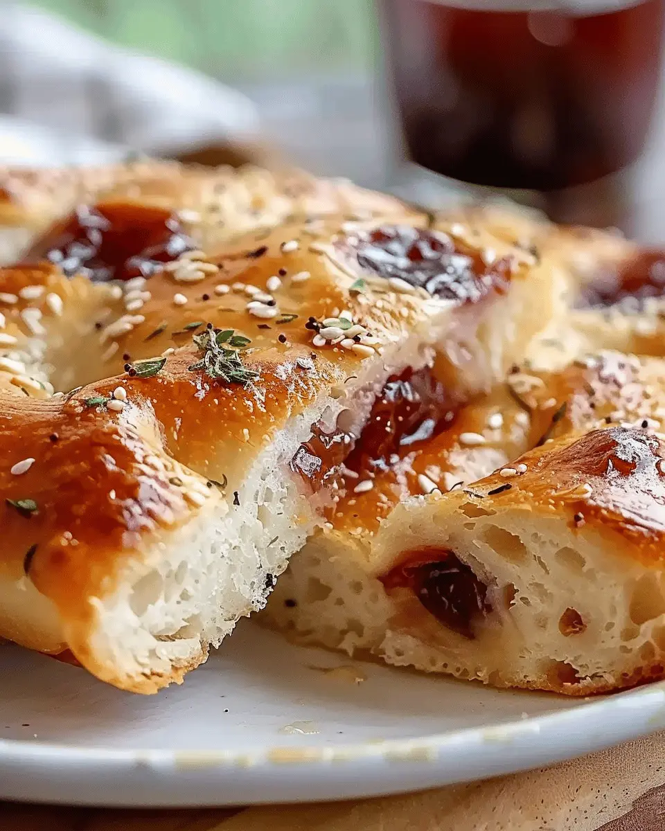 A sweet and delectable twist on traditional focaccia, featuring a jam-filled center that satisfies your sweet tooth.