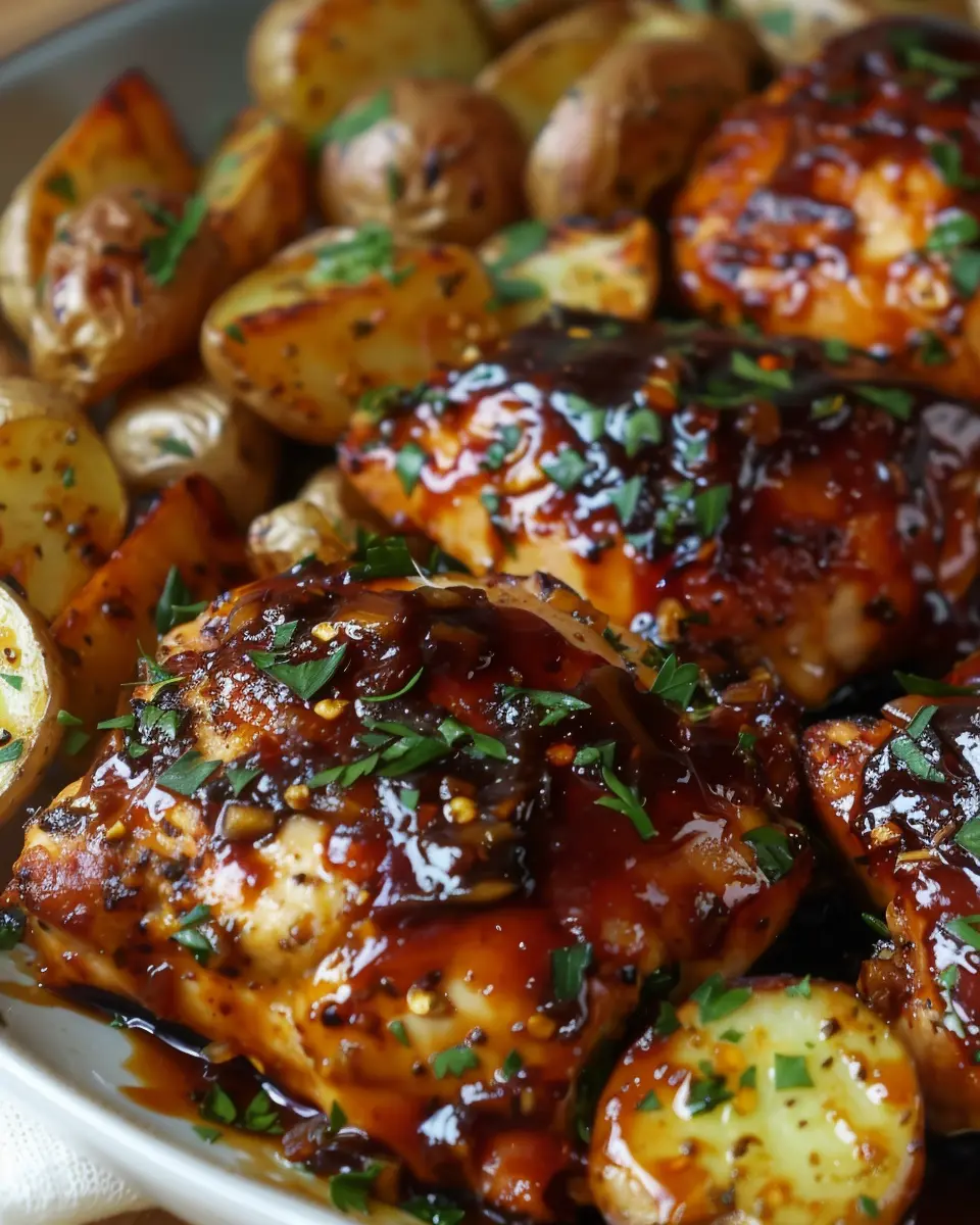 Delicious Honey BBQ Chicken served with flavorful garlic potatoes, perfect for an easy weeknight dinner.