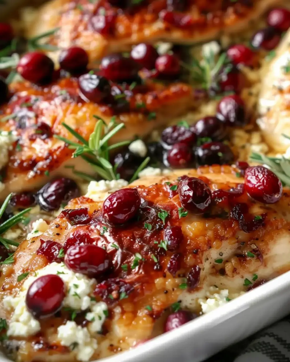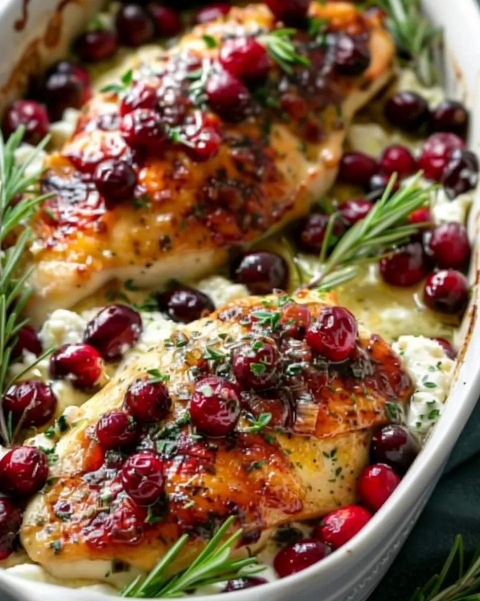 • Instructions: Simply layer the thyme under the chicken breasts, then pour the honey-cranberry mixture over everything. Top it off with a generous sprinkle of goat cheese before baking for about 30-35 minutes at 375°F.