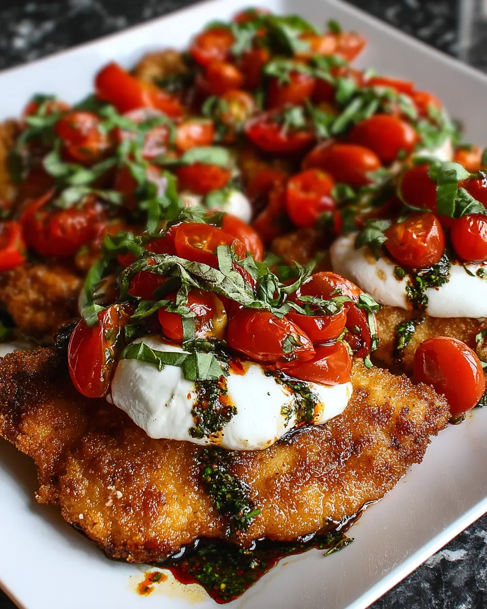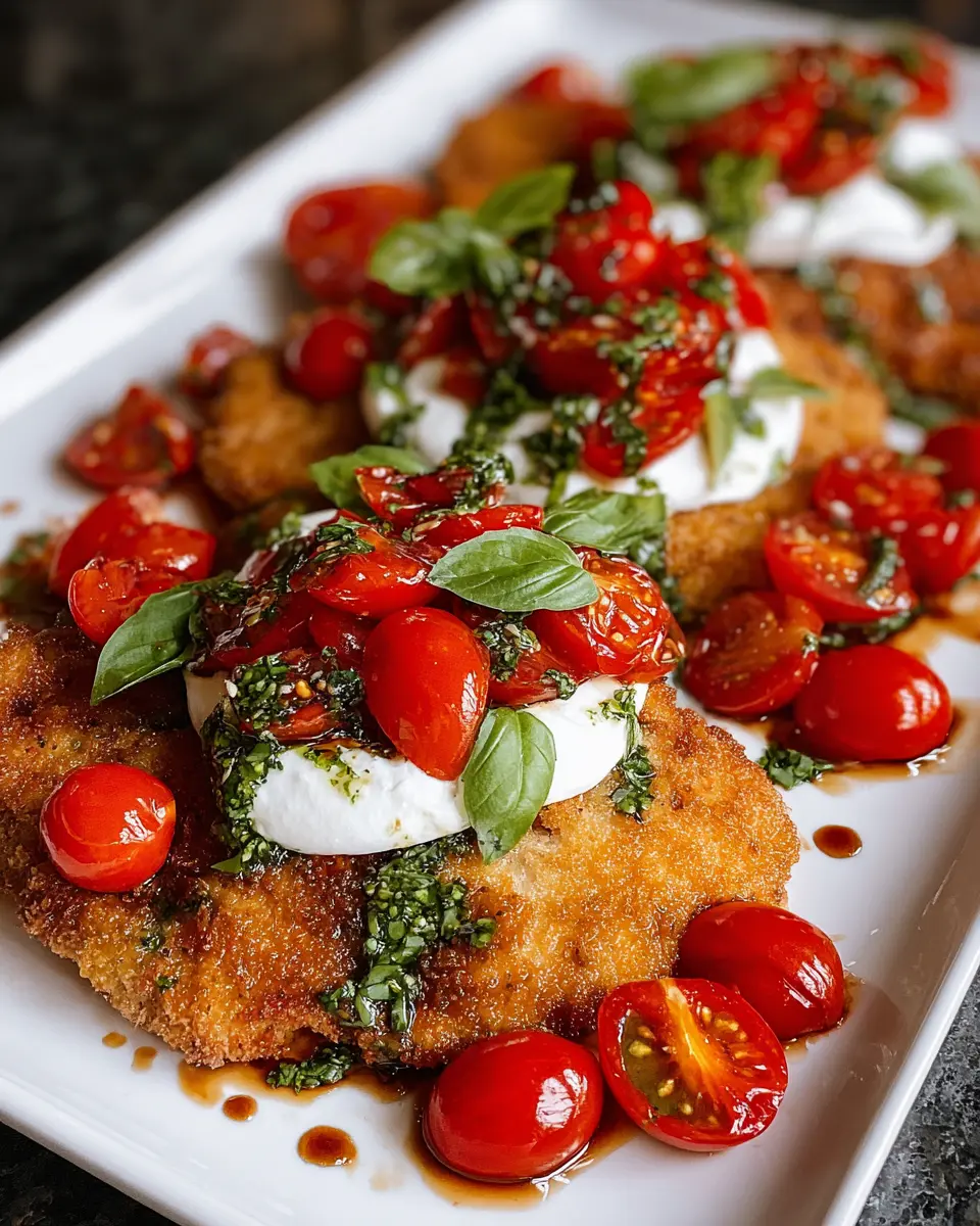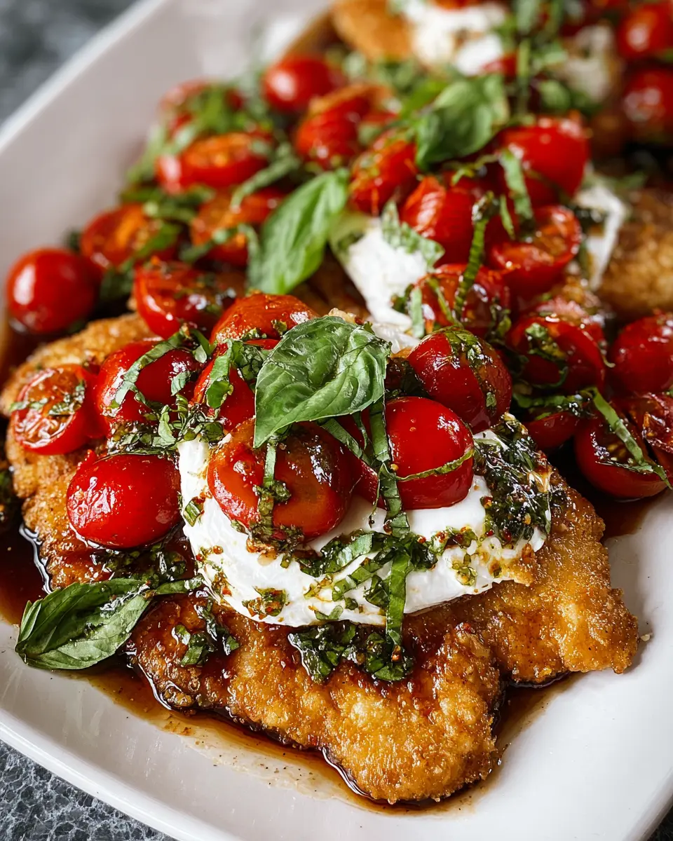 To serve, place your crispy chicken cutlets on a platter and generously spoon the tomato and basil topping over the top. For an extra touch of indulgence, add slices of creamy burrata cheese—this will melt slightly into the warm chicken, creating a beautiful, rich texture.