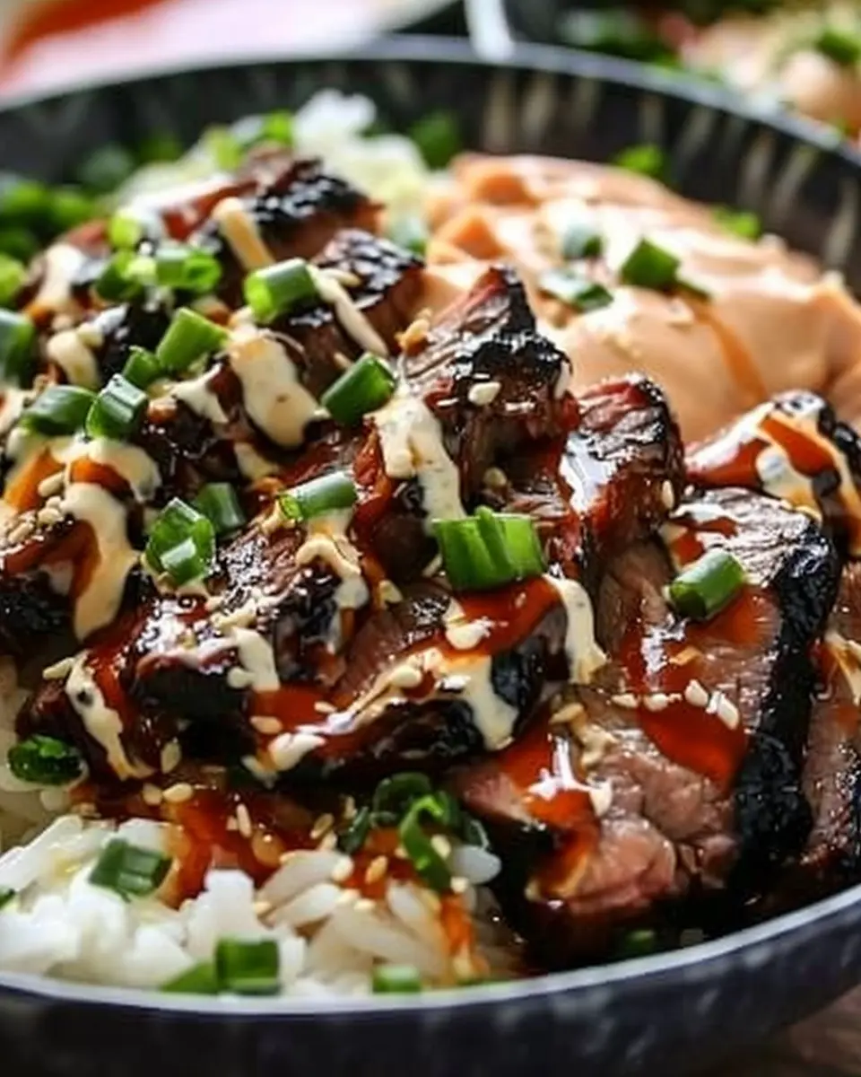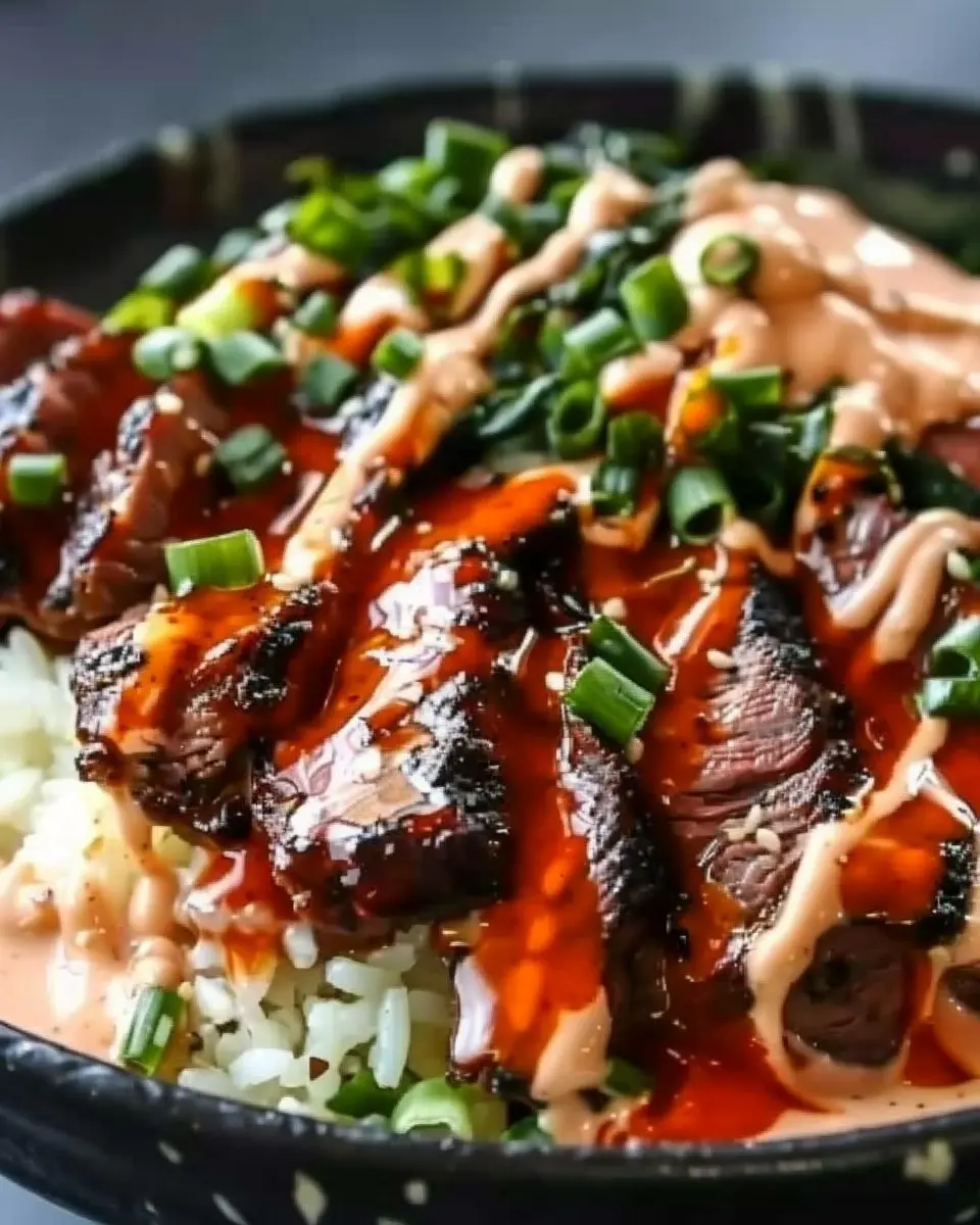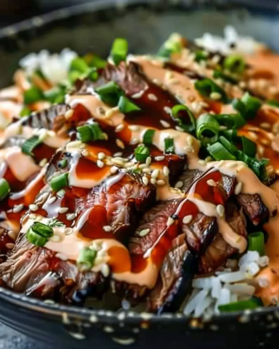 PrintKorean BBQ Steak Rice Bowls with Spicy Cream Sauce: Easy Delight