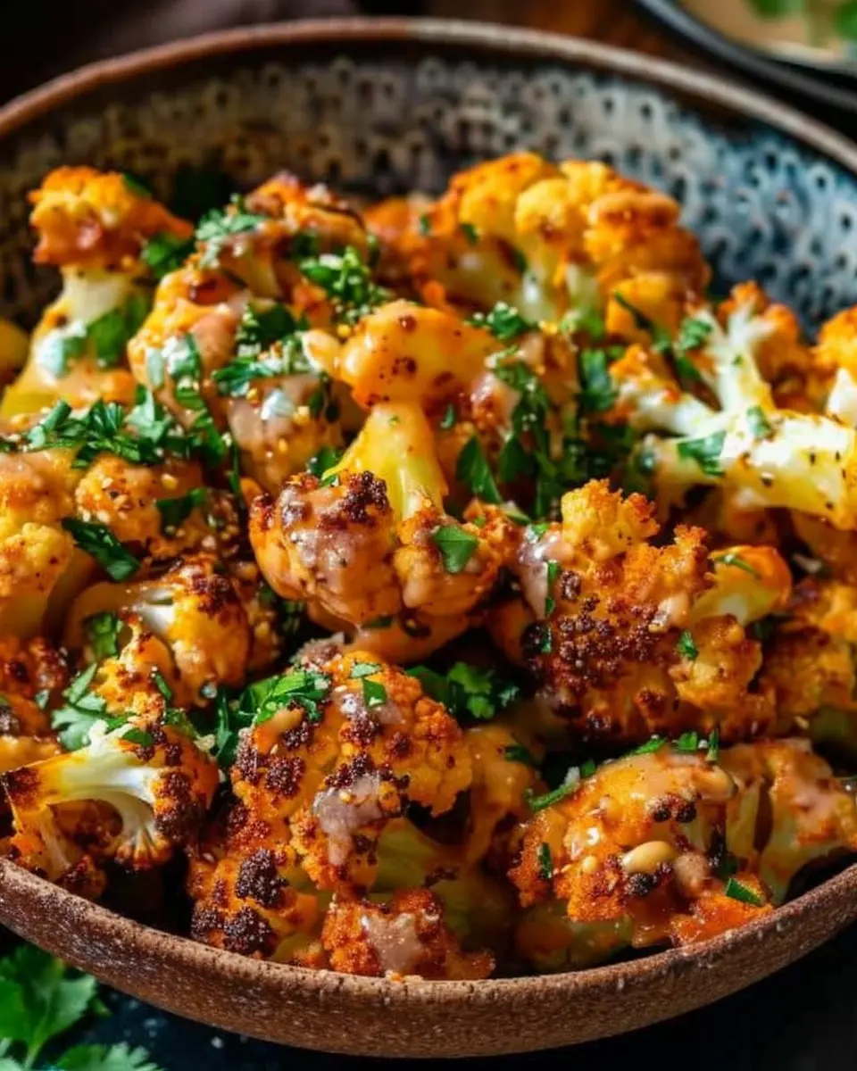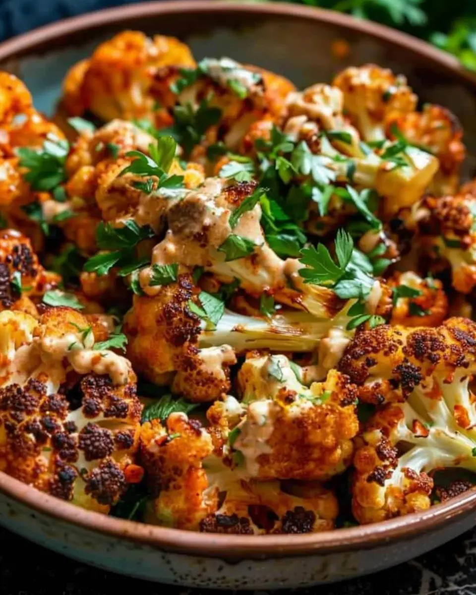 Once your cauliflower is beautifully roasted, remove it from the oven and transfer it to a serving bowl. Drizzle the tahini-honey sauce generously over the cauliflower, allowing the flavors to meld together. To finish, consider garnishing with fresh chopped parsley or cilantro and a sprinkle of sesame seeds for that extra crunch and sass.