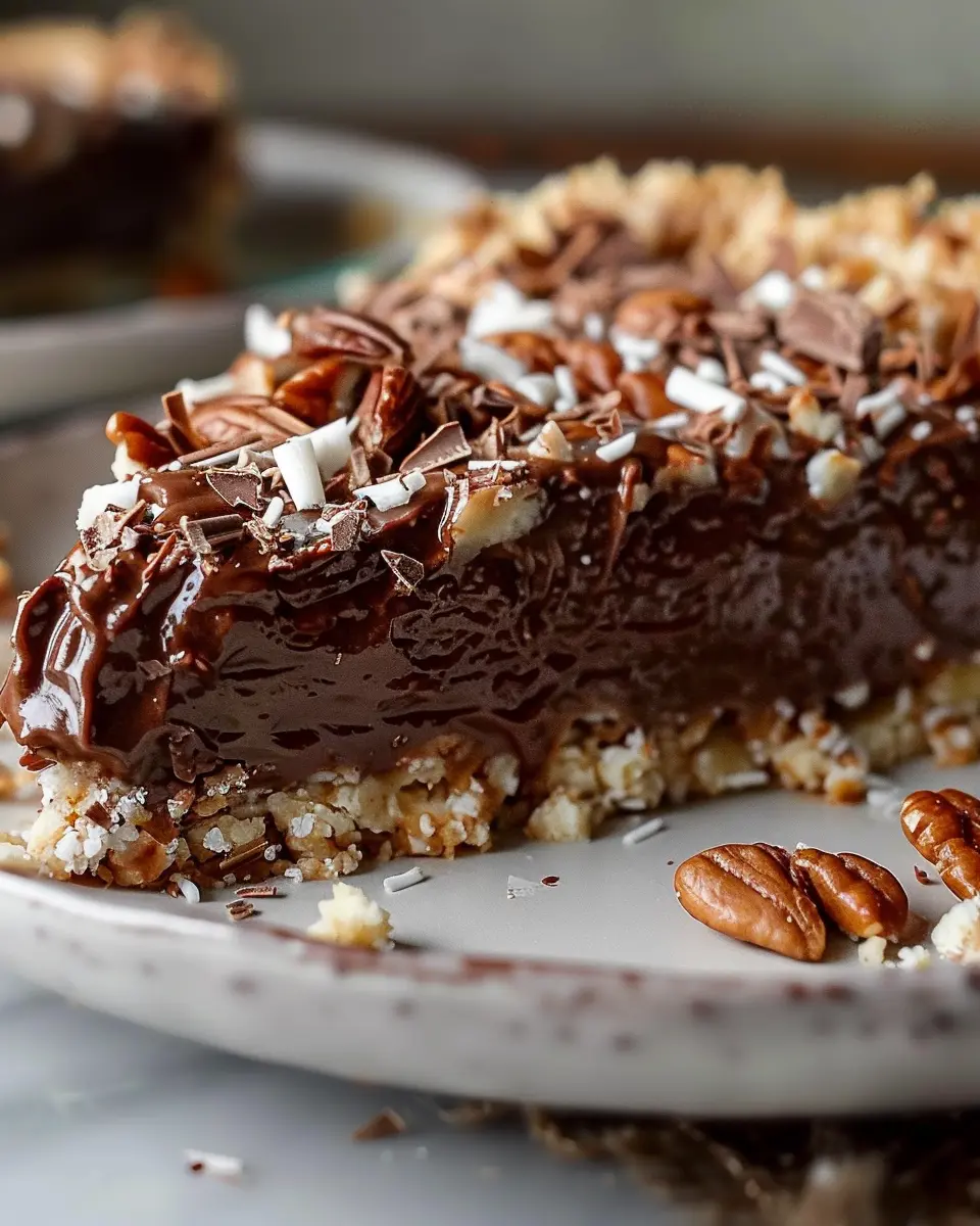 Nutrition-wise, making this pie can be a great opportunity to use higher-quality ingredients. Opt for organic dark chocolate, fresh pecans, and unsweetened coconut flakes; not only do they taste amazing, but they also elevate the dish to a healthier choice compared to store-bought alternatives.