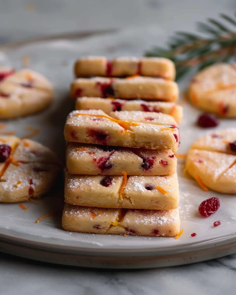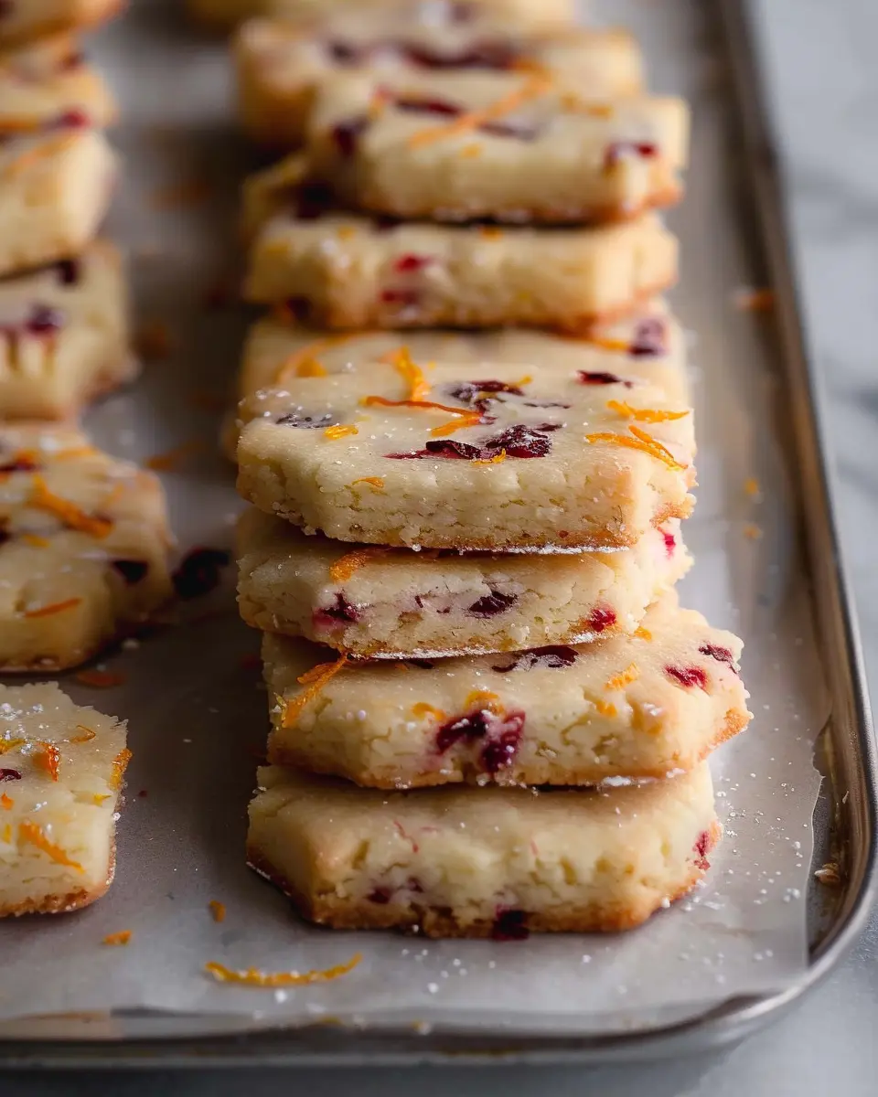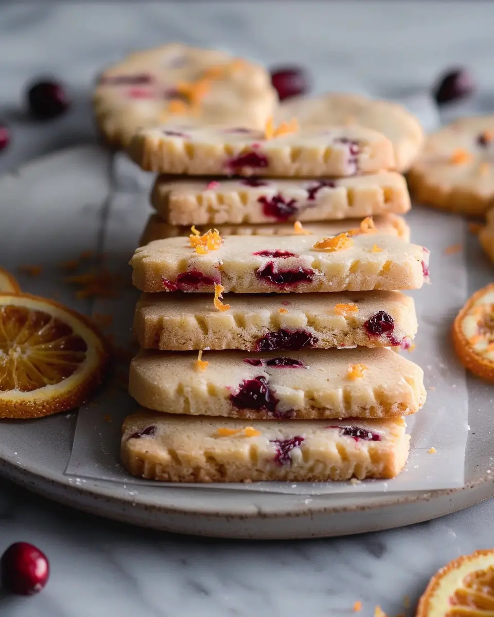 Deliciously buttery shortbread cookies with a hint of orange zest and tart cranberries, perfect for any occasion.