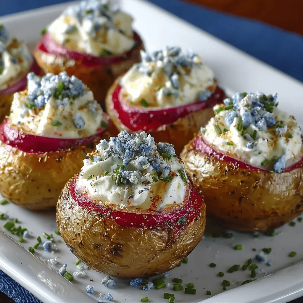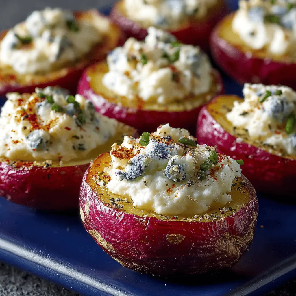 Part of what makes these deviled potatoes so enticing is their unique combination of ingredients. They are not just visually appealing; they are a delicious alternative to traditional deviled eggs. You’ll find that the creamy interior, made from tender potatoes, offers a smooth, velvety texture that’s expertly complemented by toppings like blue cheese or blueberries, cherry tomatoes, and turkey bacon. Each bite delivers a burst of flavor that keeps your guests coming back for more.
