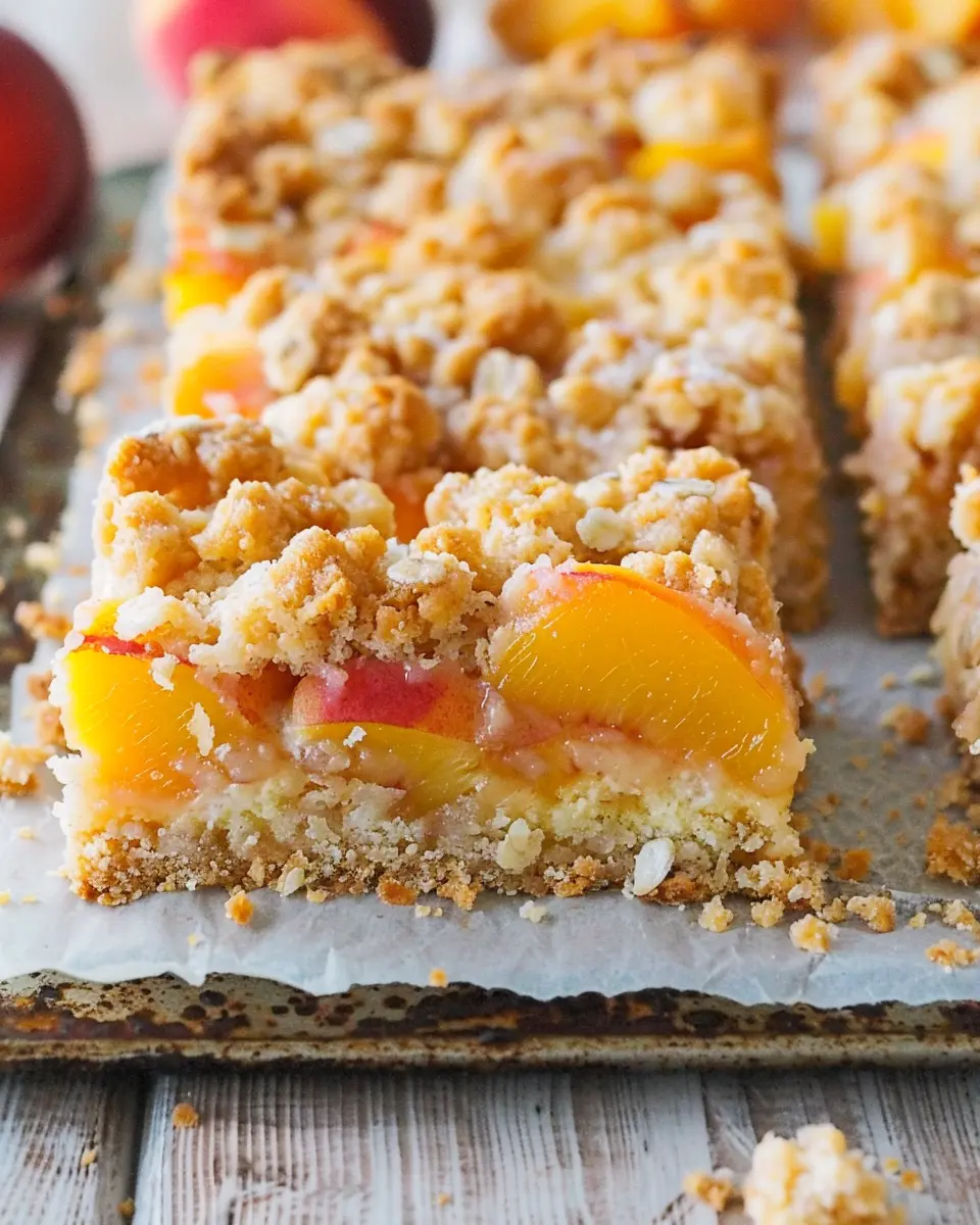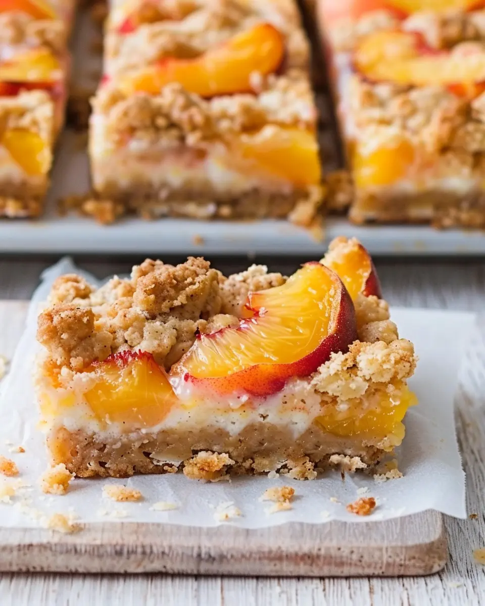 Enjoy the delightful combination of peaches and cream in these easy-to-make crumble bars. Perfect for dessert lovers looking for a simple treat!