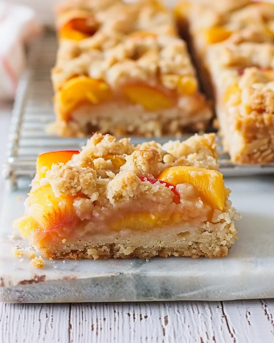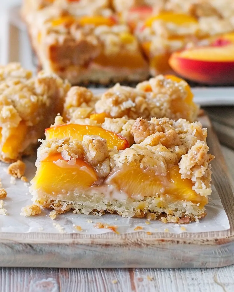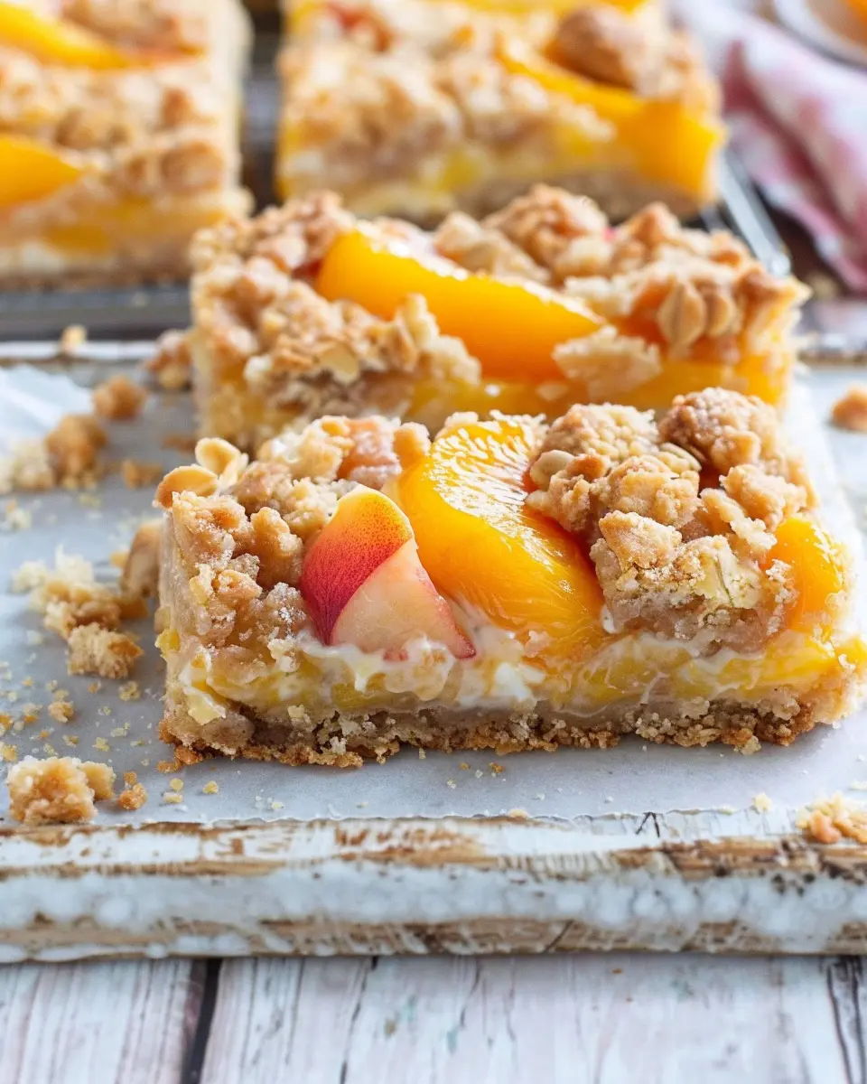 Enjoy the delightful combination of sweet peaches and creamy filling in these crumble bars, perfect for summer gatherings.