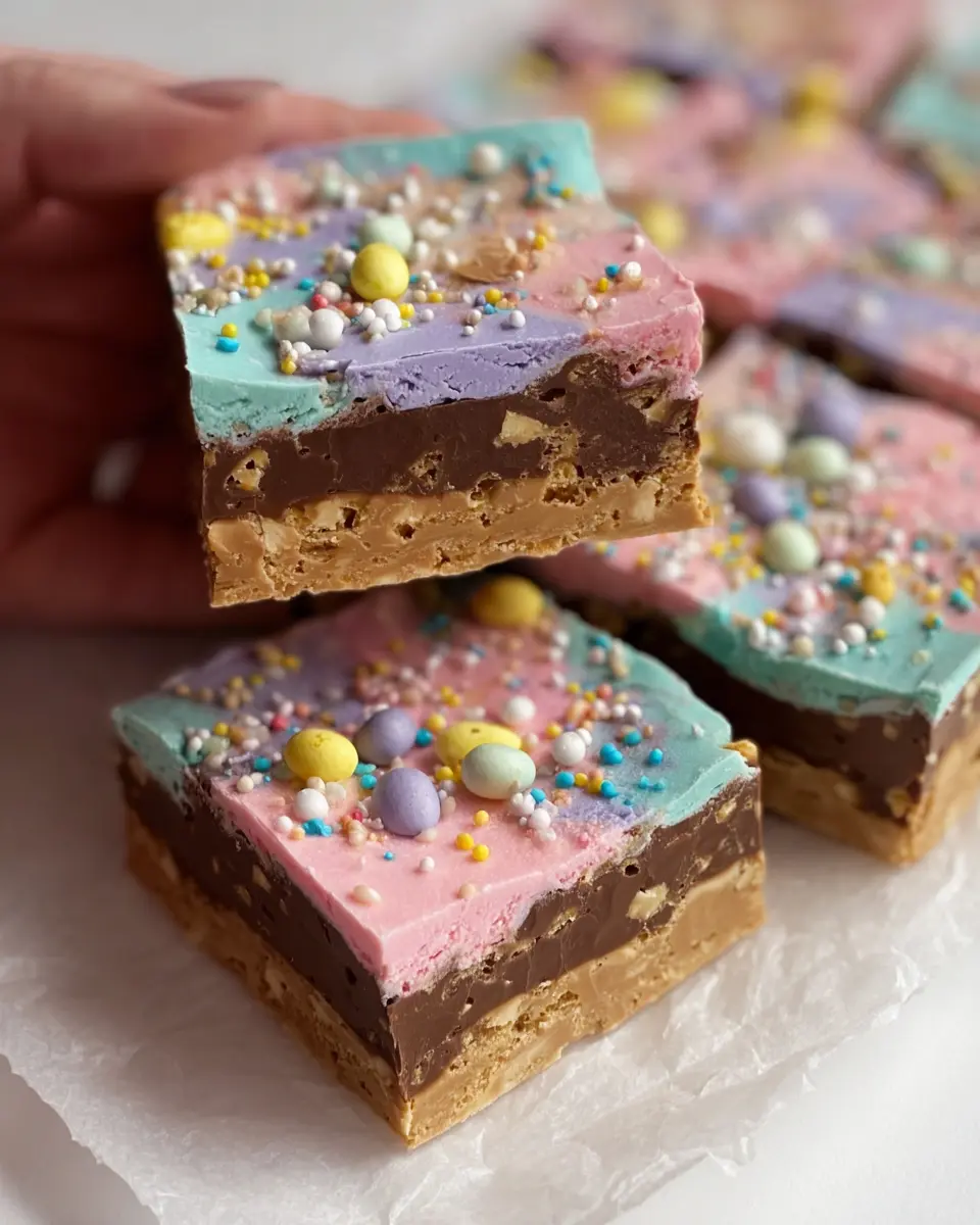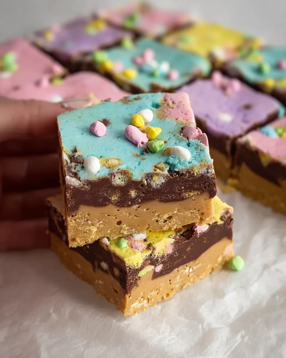 These Peanut Butter Pastel Egg Bars are a delectable treat that combines the rich flavor of peanut butter with a colorful, festive twist, making them perfect for any occasion.