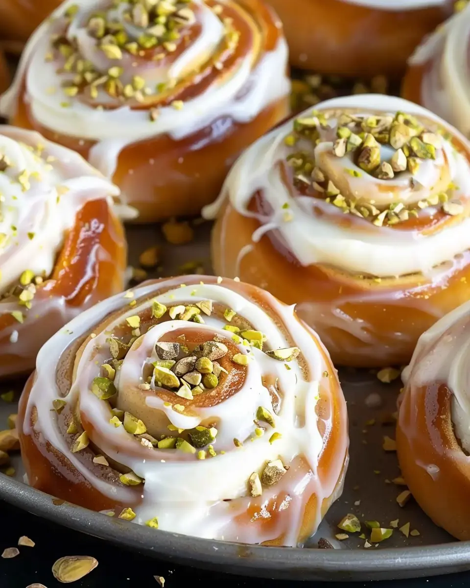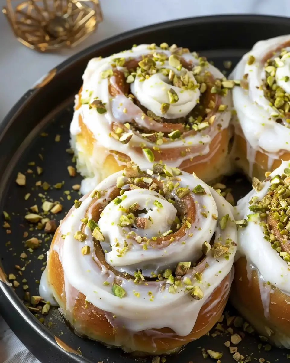 Once the rolls have cooled slightly, slather on that creamy frosting. Feel free to sprinkle some extra pistachio pieces on top for an added pop of color and flavor.