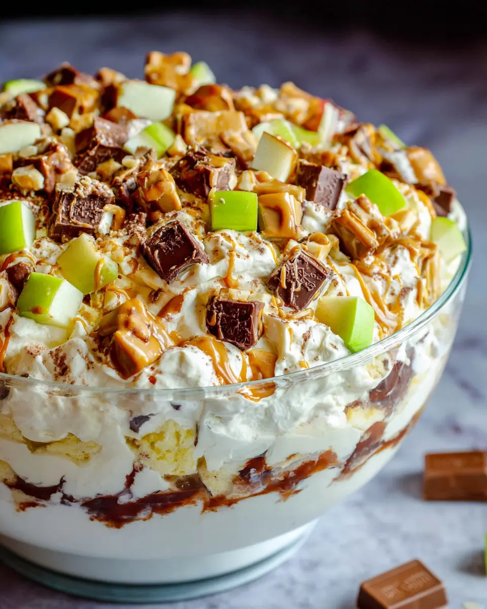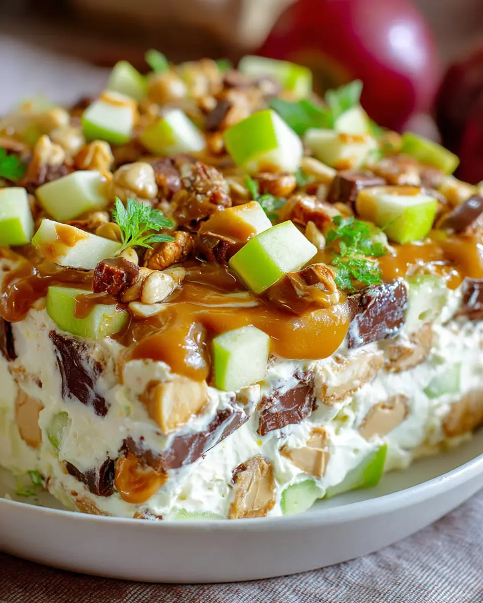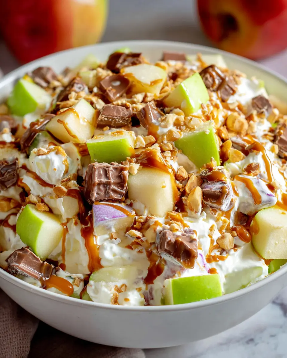 Indulge in a delicious Snickers Apple Dessert Salad, perfect for gatherings and a unique dessert experience.