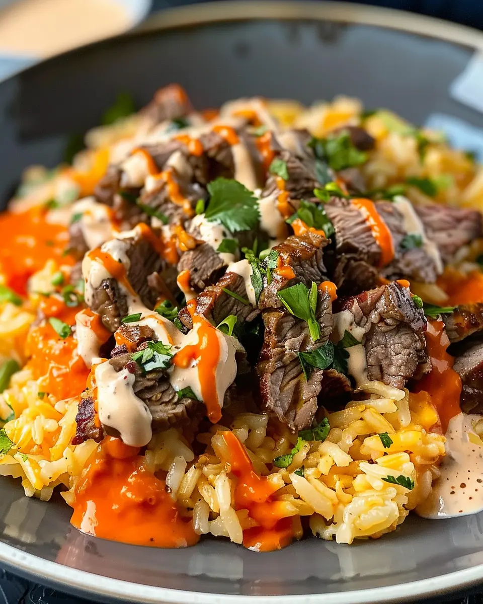Layering: In a bowl, start with a generous base of your fluffy rice, followed by a portion of the sliced steak. Drizzle that creamy queso sauce over the top.