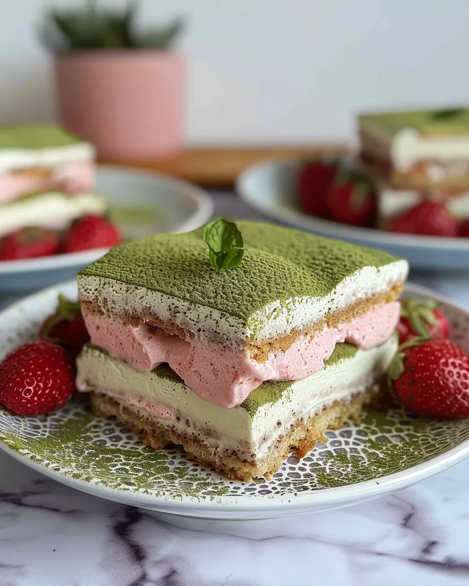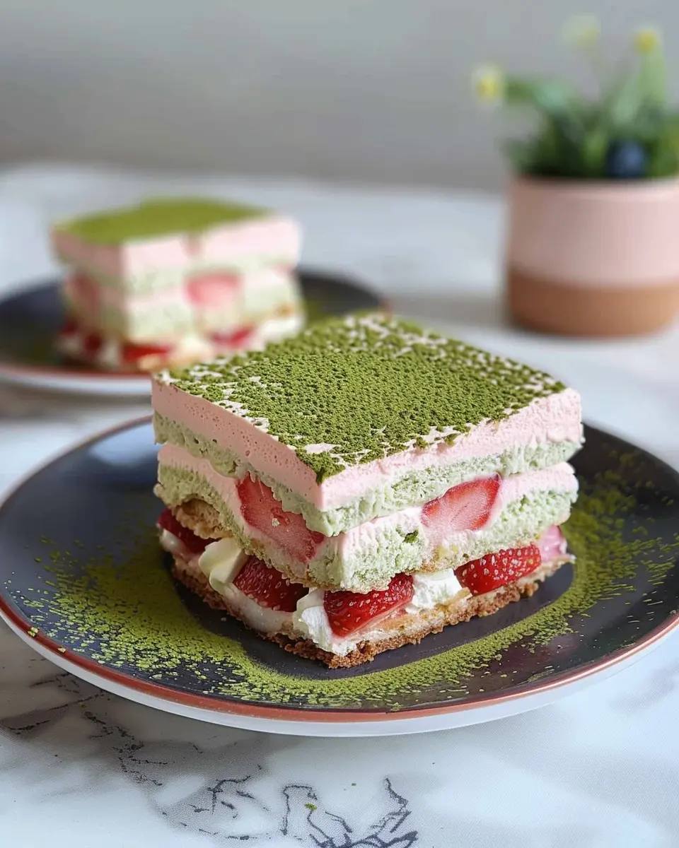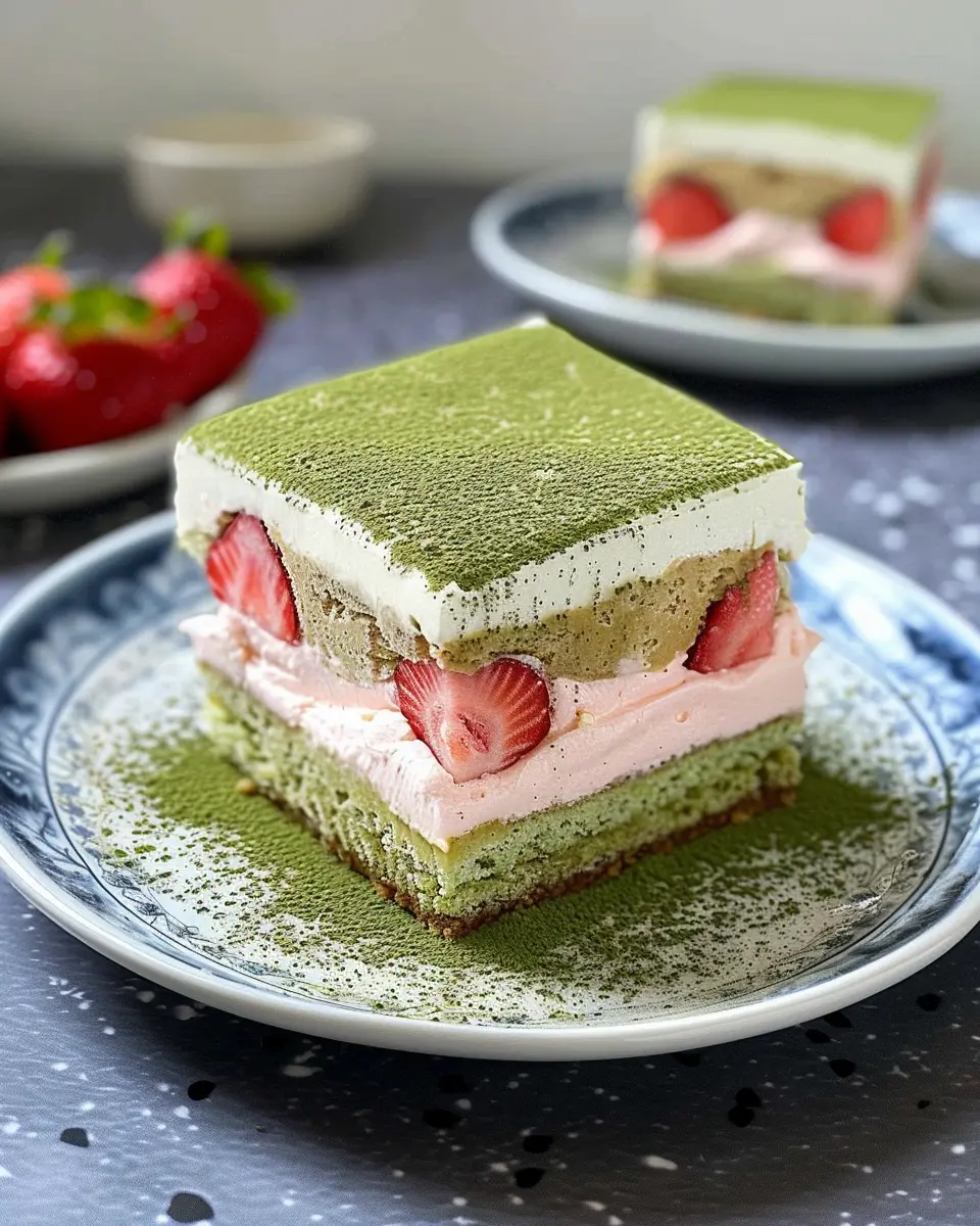A delicious and innovative take on the classic tiramisu, featuring fresh strawberries and matcha.