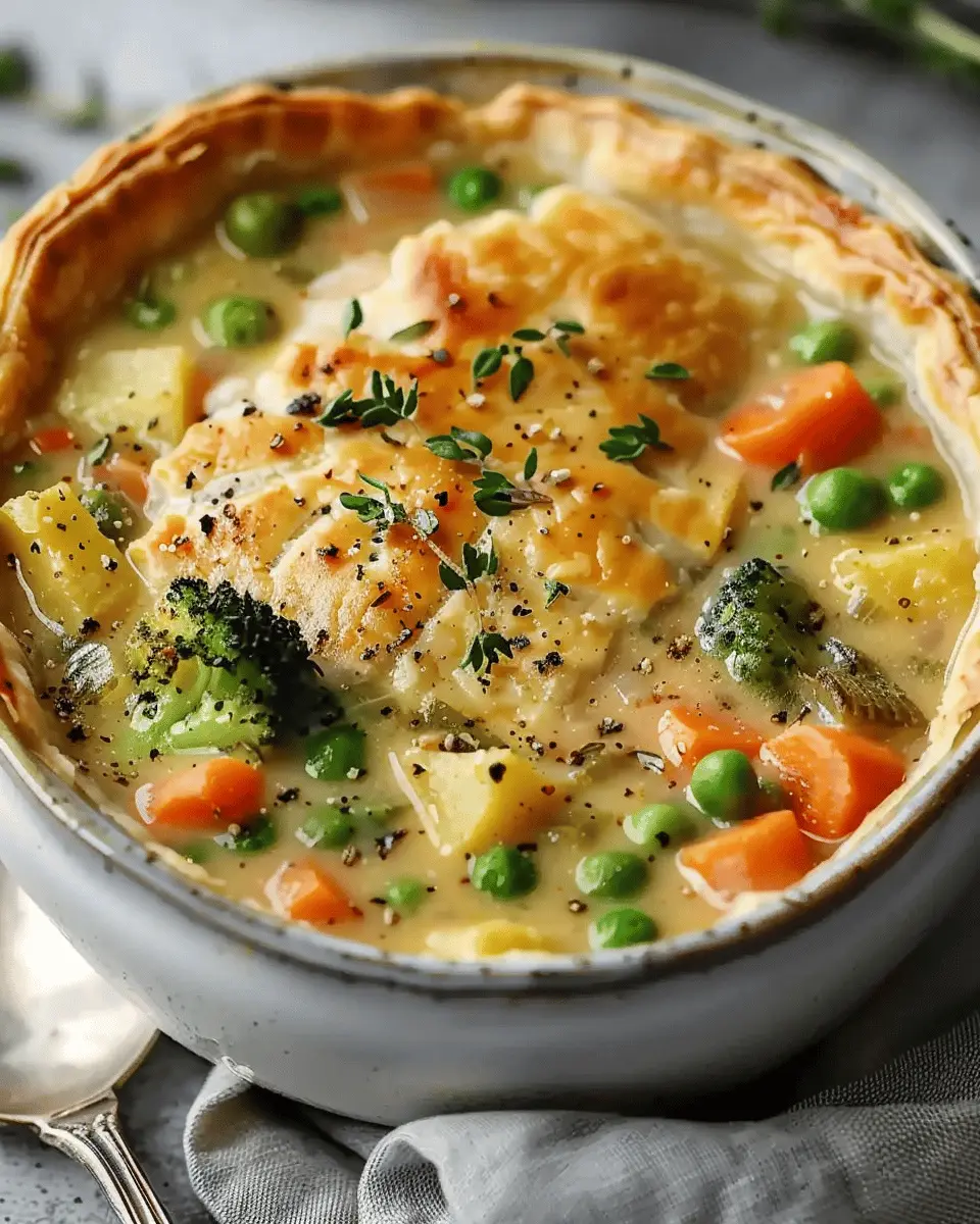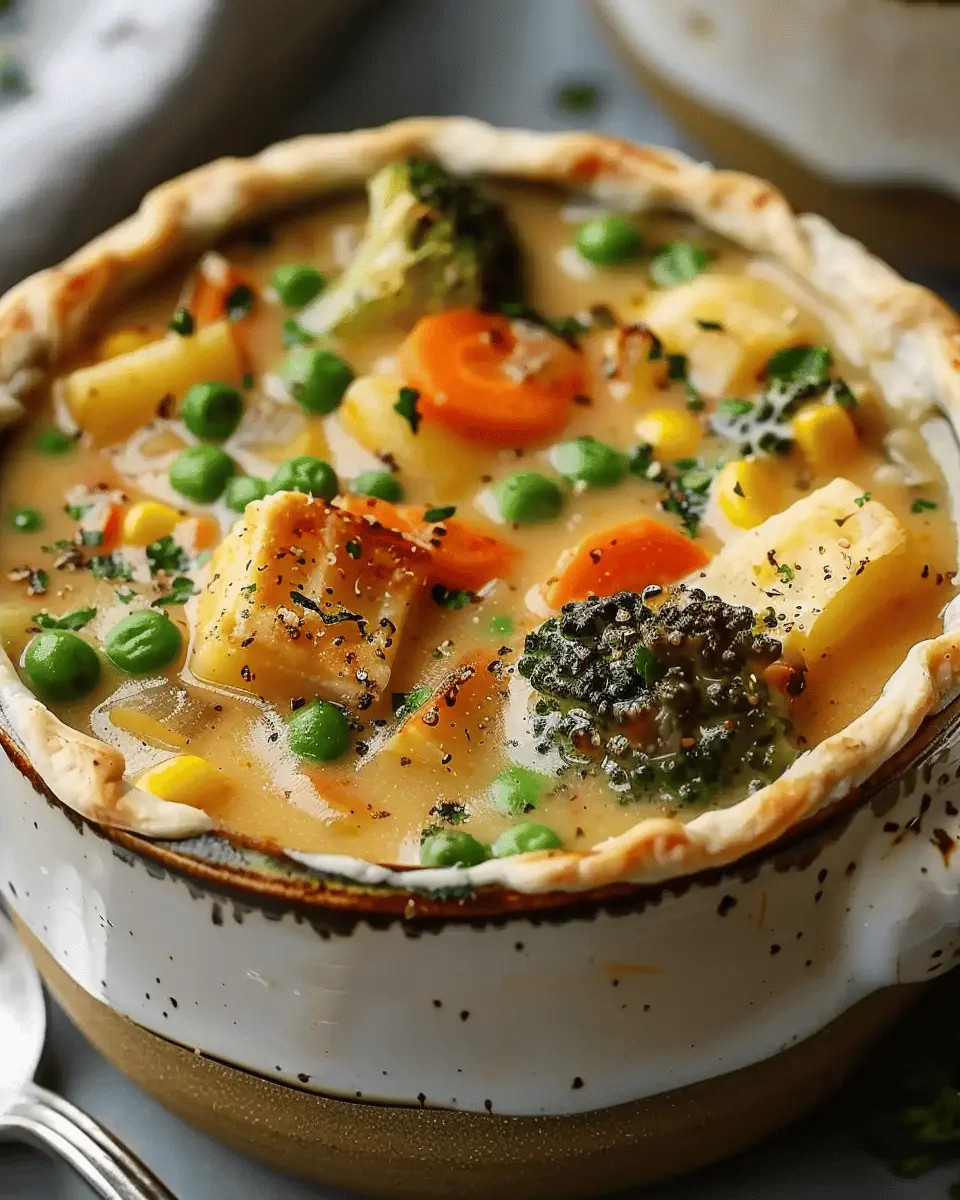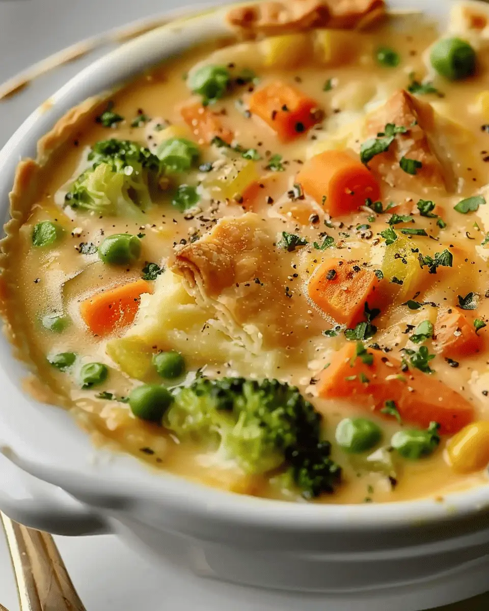 Enjoy a warm bowl of Veggie Pot Pie Soup, the perfect cozy meal for chilly nights.